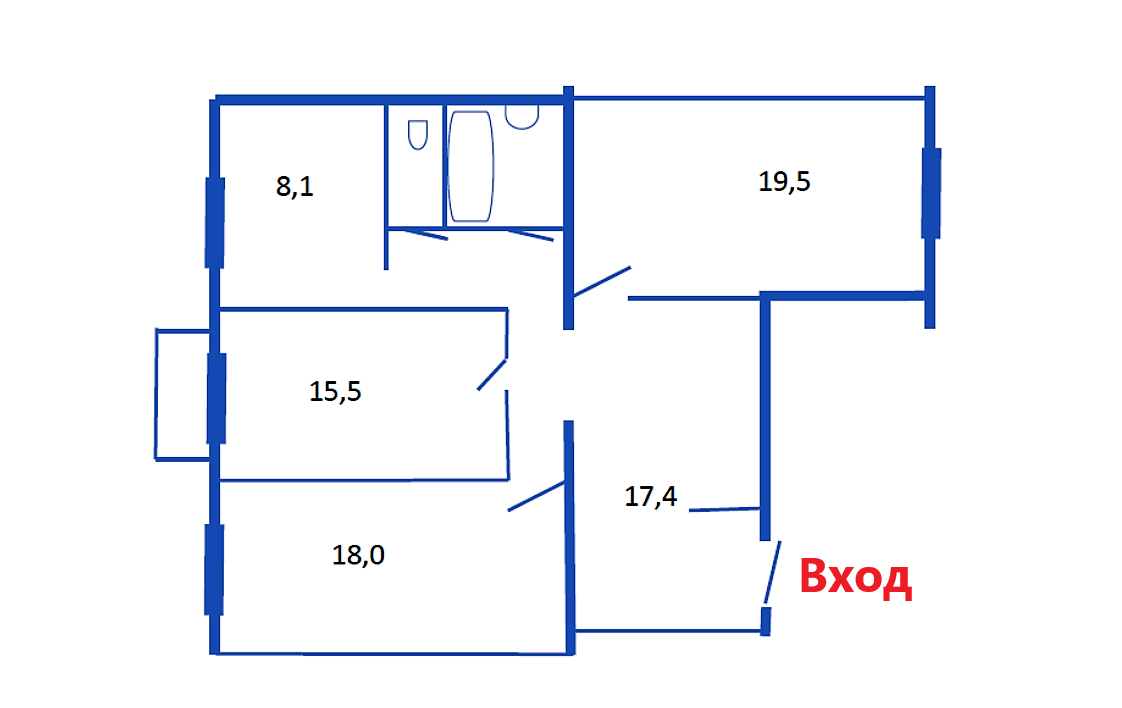 Общая площадь - 92,1 кв.м., все комнаты изолированные - 19,5 / 18,0 / 15,5 кв.м., кухня - 8,1 кв.м., просторный холл - 17,4 кв.м., санузел раздельный, балкон застеклен.