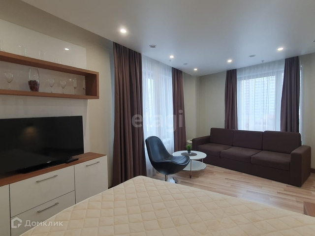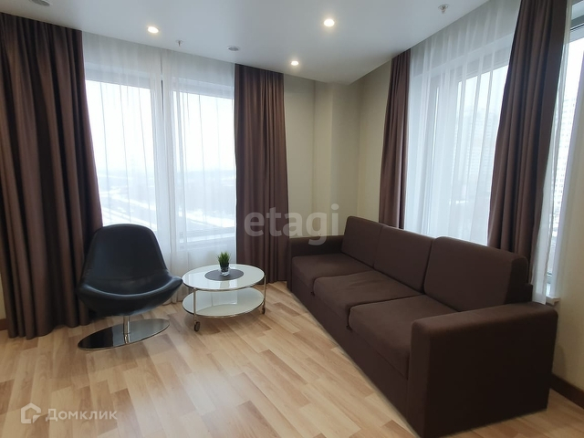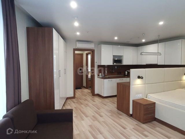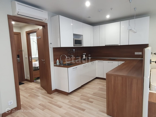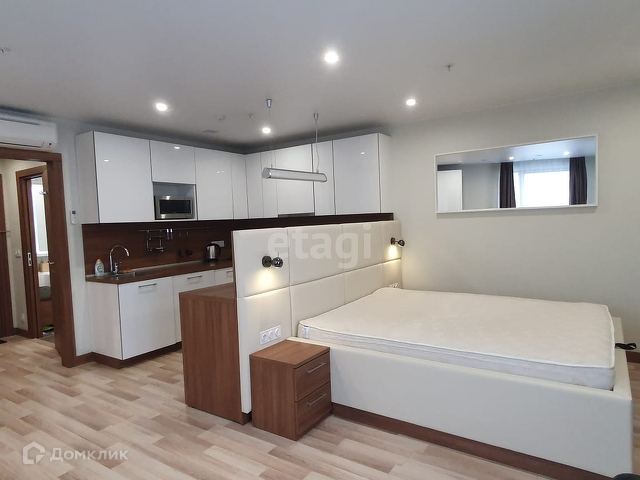Апартамент расположен на 6 этаже, полностью обустроенный с дизайнерским ремонтом: есть всё необходимое для комфортного проживания. Кухня с встроенной техникой (холодильник, стиральная машинка, варочная панель, микроволновая печь, чайник). Есть обеденная зона с барной стойкой и двумя стульями. Удобная система хранения вещей. В апарт-отеле 4 пассажирских лифта.