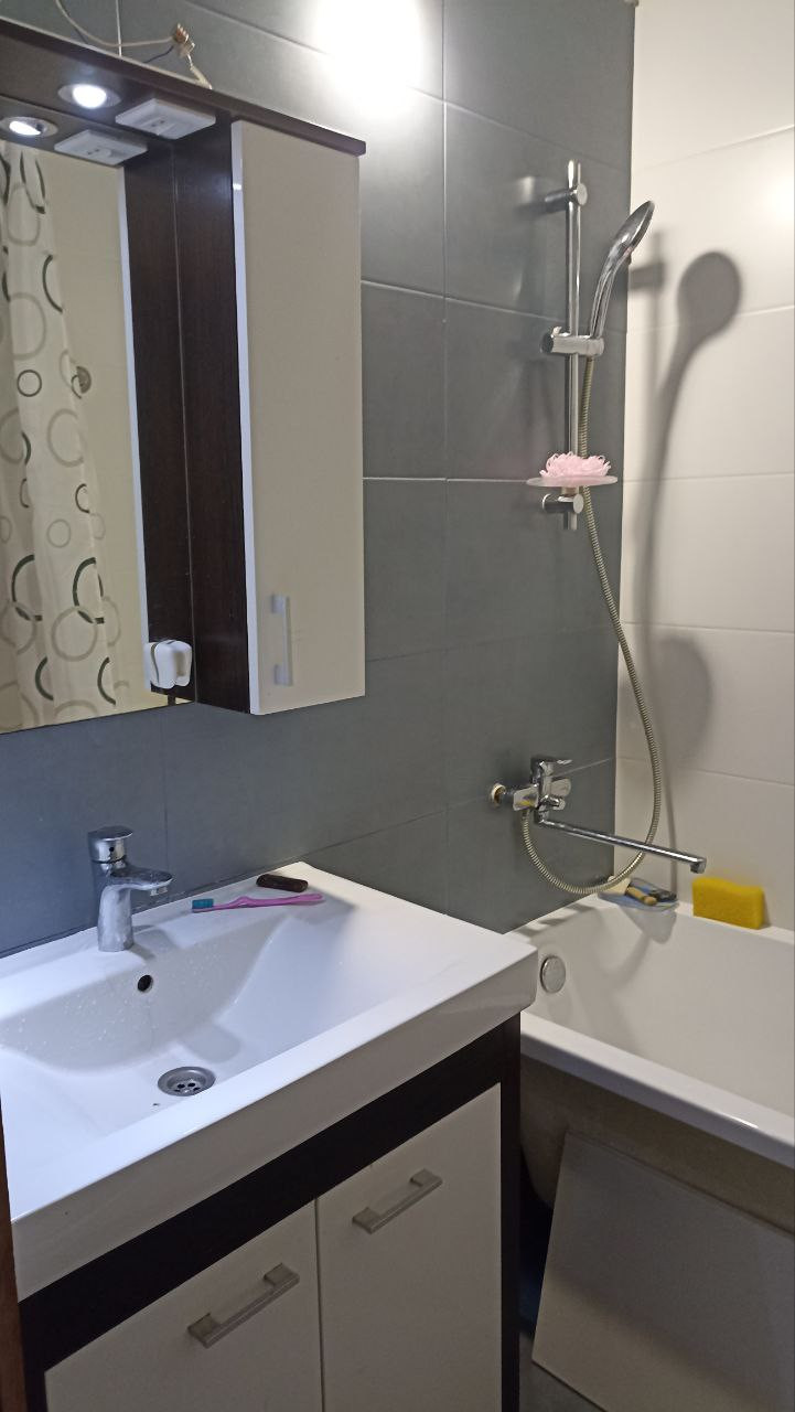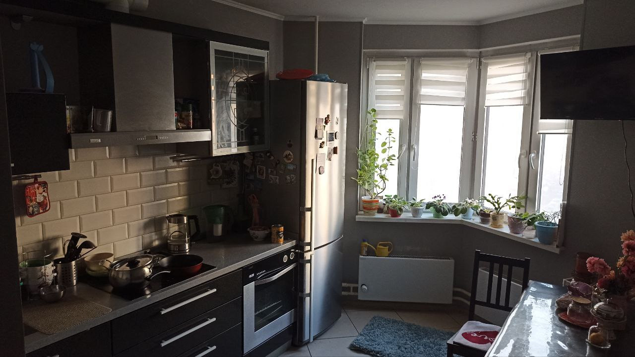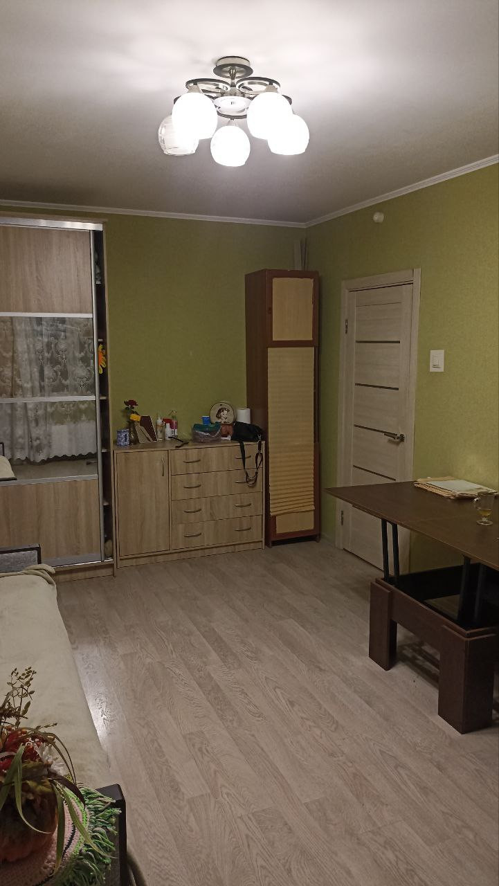 окна выходят во двор. Инфраструктура: магазины, школа, детский сад, 3 минуты до поликлиники (взрослая и детская). Кухня остаётся кроме холодильника, большая часть мебели остаётся. На полу ламинат повышенной износостойкости и керамогранит.