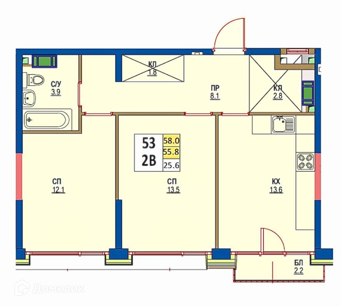 Общая площадь 58 м2