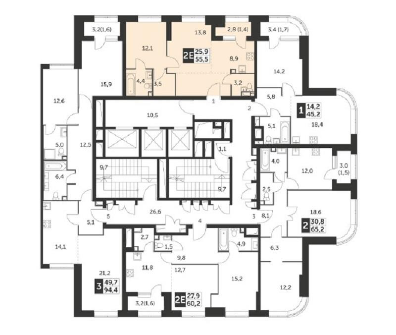 Общая площадь 55.5 м2