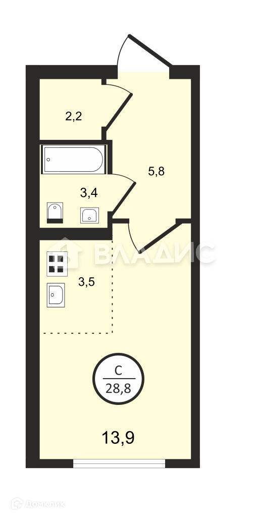 Общая площадь 28.8 м2