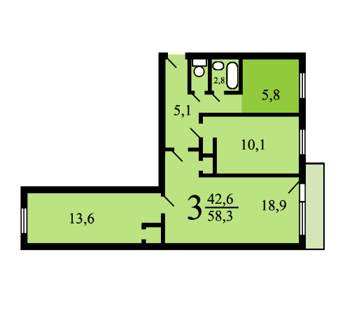 Общая площадь 58.3 м2