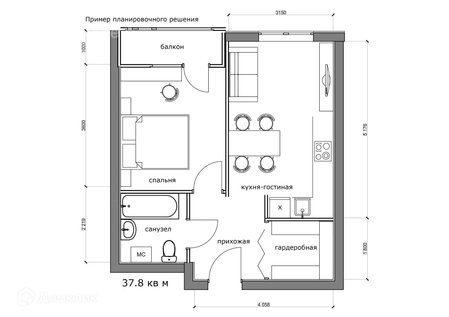 Общая площадь 38 м2