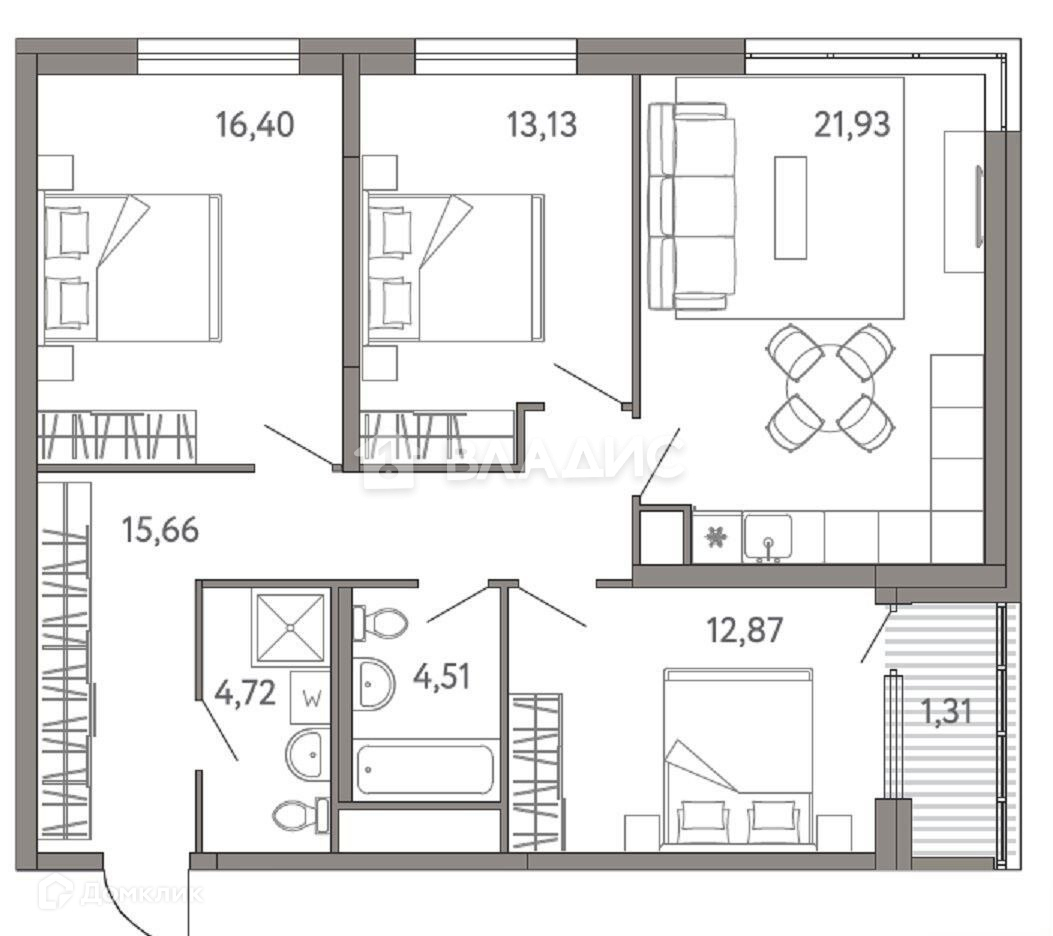 Жилая площадь 64.3 м2