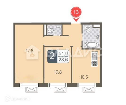 Квартира в черновом варианте, без отделки. Площадь комната 17,8 м2, 10,8 м2, кухня 10,5 м2