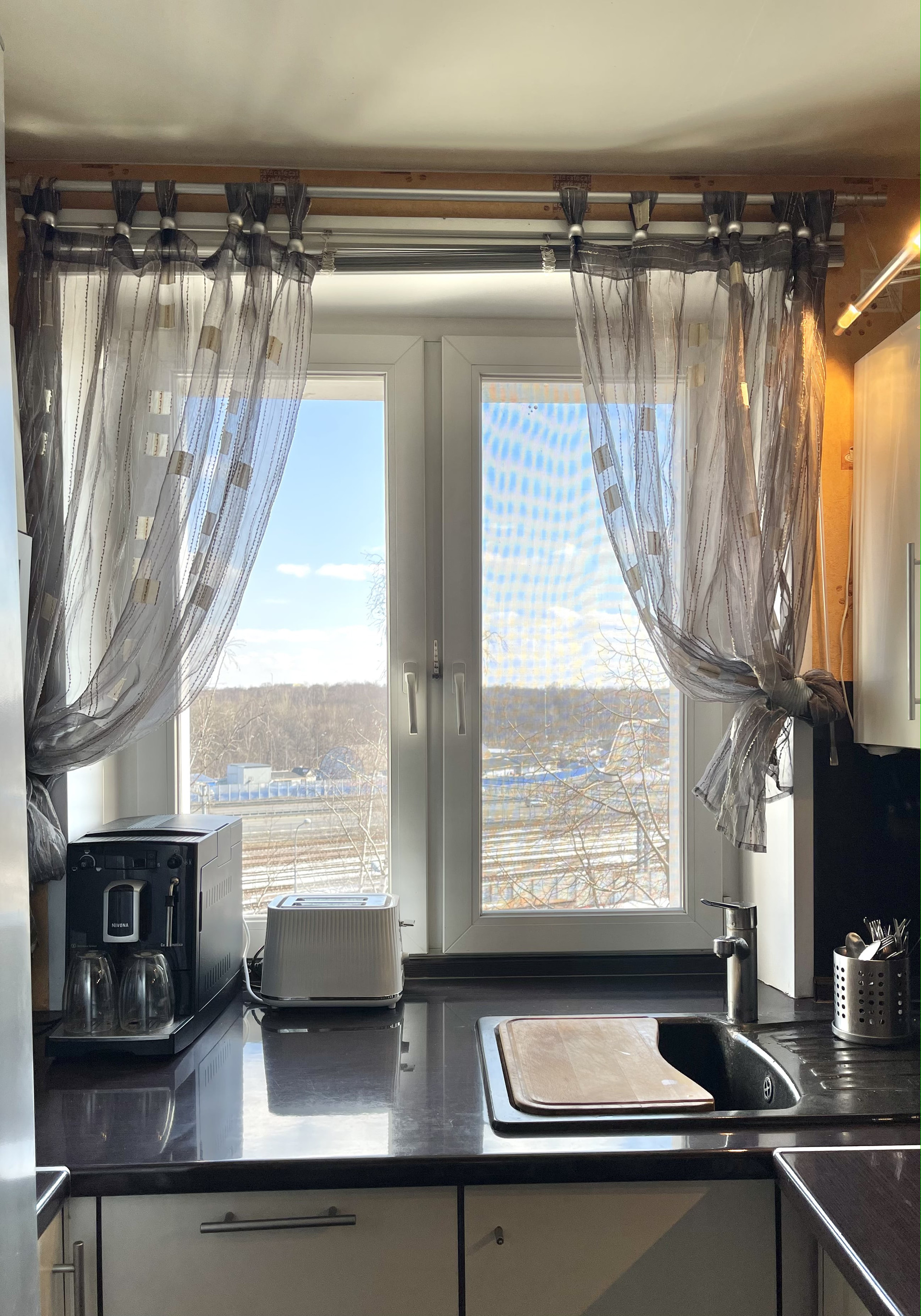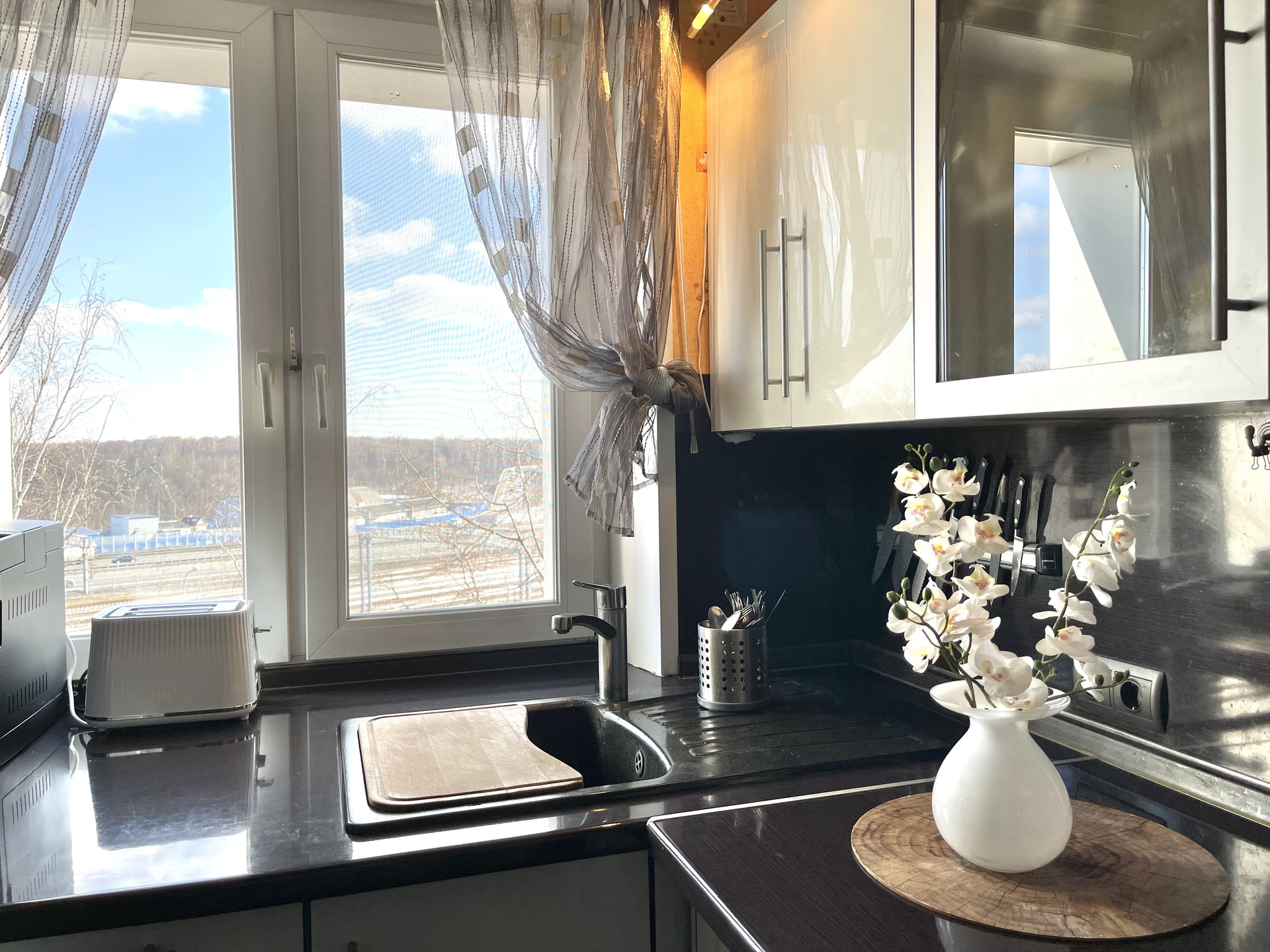 Красивая плитка в санузле. Отличная встроенная кухня, и изюминка квартиры - раковина напротив окна с красивым видом на Измайловский парк!