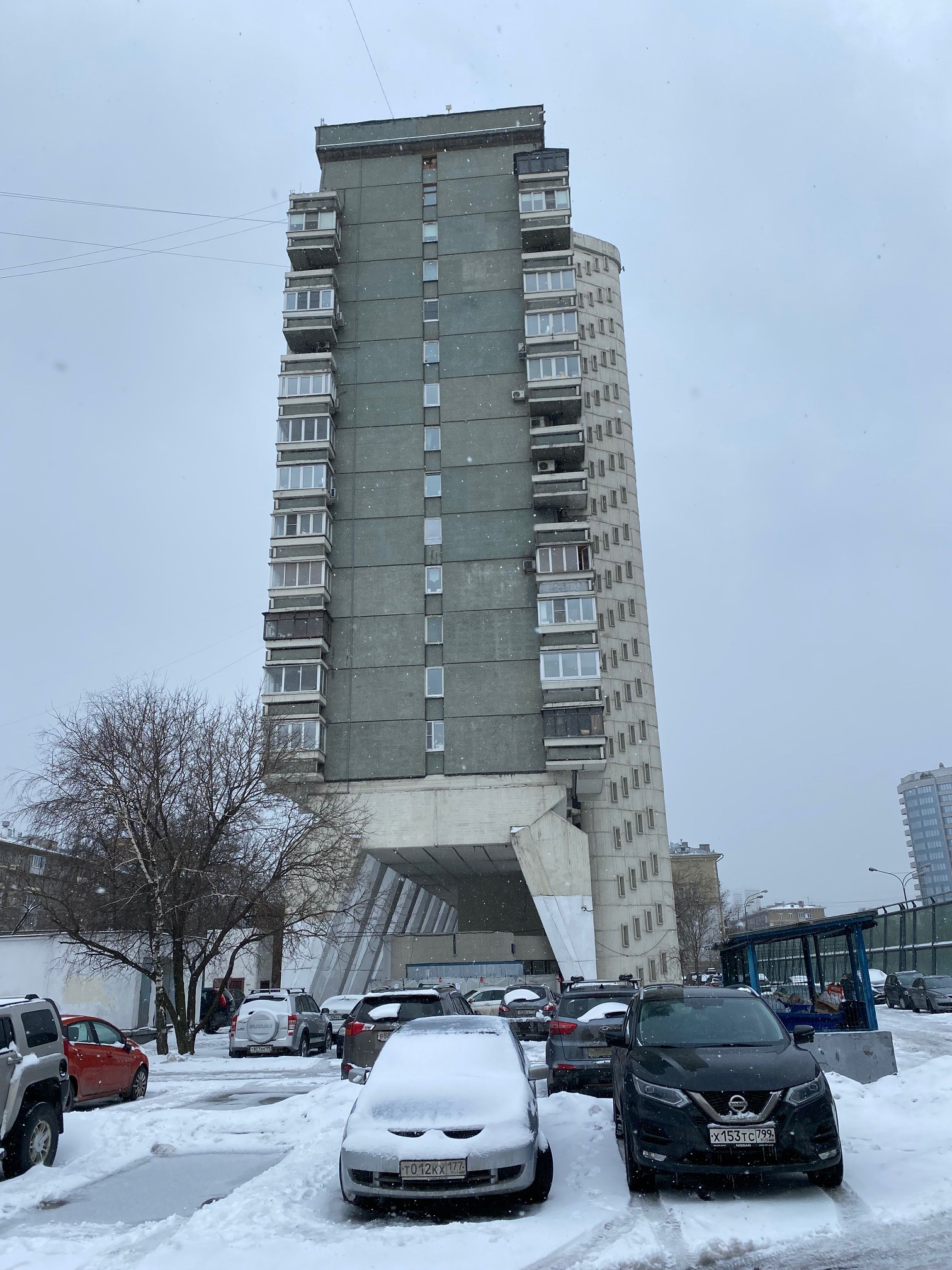 Дом был построен в 1973-1978 гг. по проекту Андрея Меерсона в стиле «необрутализма», одной из ветвей послевоенно архитектурного модернизма. При строительстве была впервые в СССР использована  технология монолитного железобетона (основание и опоры дома).