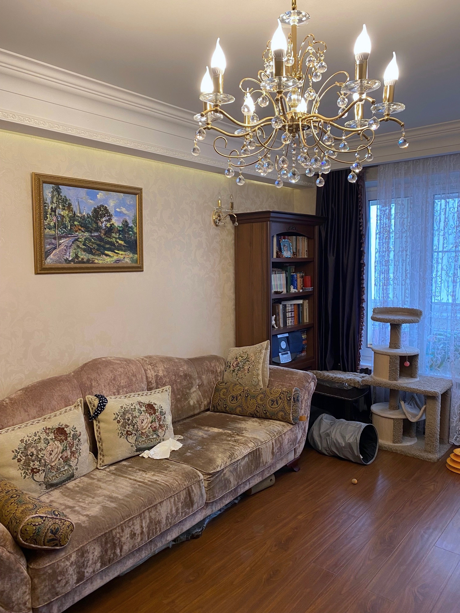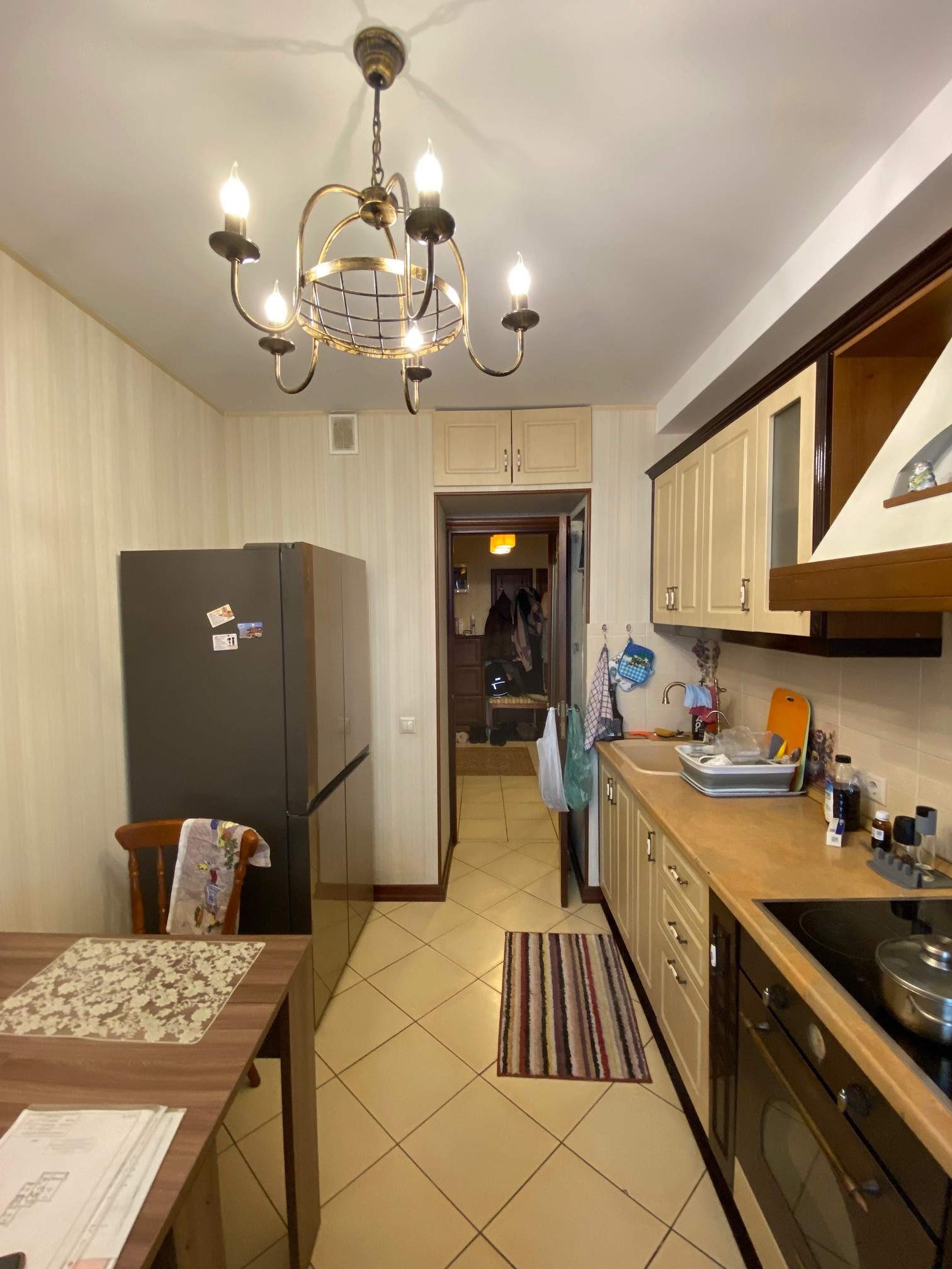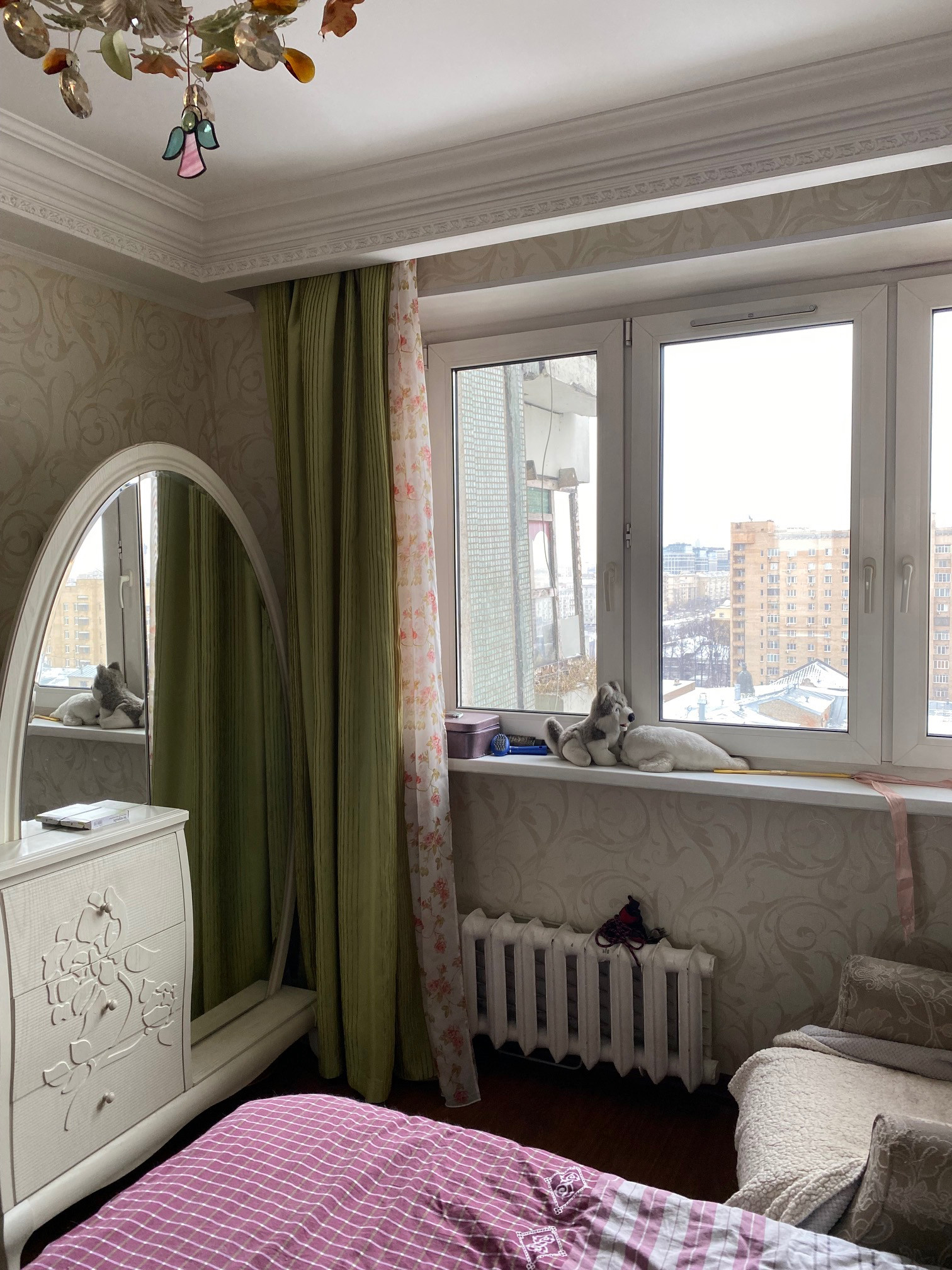 Квартира  большая, светлая, двусторонняя.  Размер комнат: 22,9-10,5-12,6 кв.м. Расположена на 10 этаже (фактически 14). Окна спальни - во двор, окна гостиной и кухни - на улицу. Вдоль гостиной и кухни - большая (6 кв.м) застекленная лоджия, которая преграждает шумы и пыль улицы, дополнительно установлены 2 кондиционера.  Большой холл. Ремонту 12 лет, но добротный, качественный требуется только косметика.  Парковка во дворе под шлагбаумом. Рядом магазины, Петровский Парк,  очень удобная транспортная доступность, до метро 800 м, рядом - остановка автобуса.  Собственность с 2010 г. (приватизация, 2 владельца).  Перепланировок нет.  Альтернатива - переезжаем в другой район.