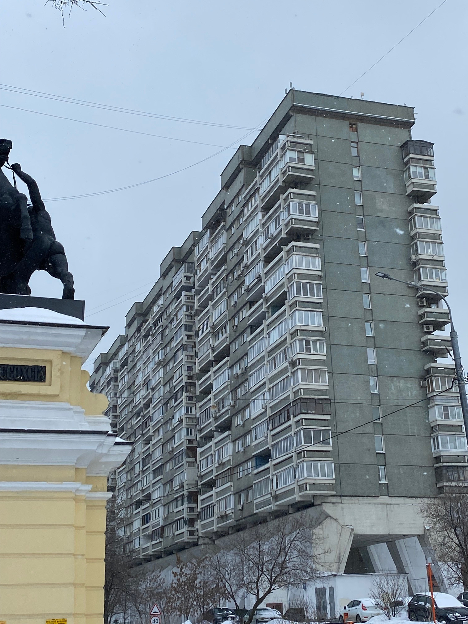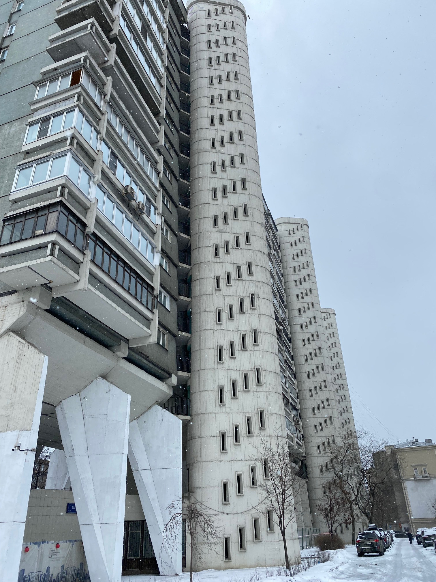 По одной из версий опоры создавались для эффекта проветривания, чтобы выхлопные газы от машин прилегаюших магистралей не скапливались в помещениях. Кроме того, «ножки» поднимают первый этаж на уровень четвертого.