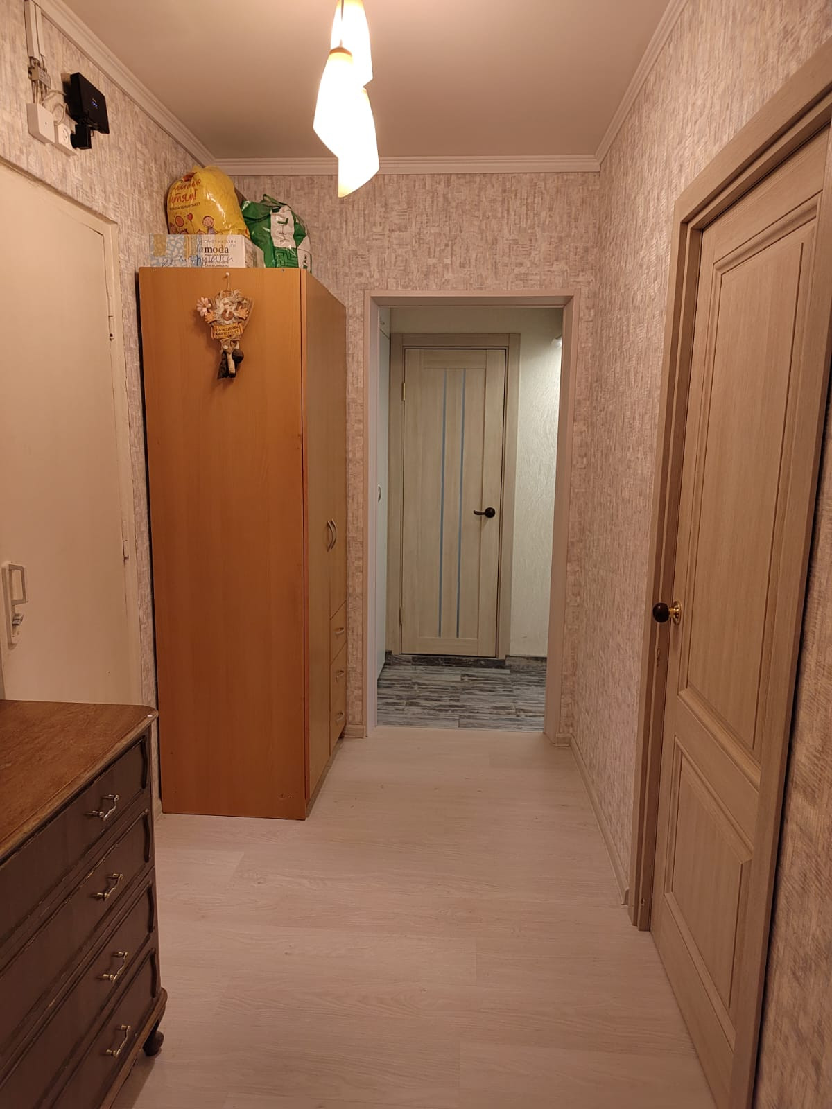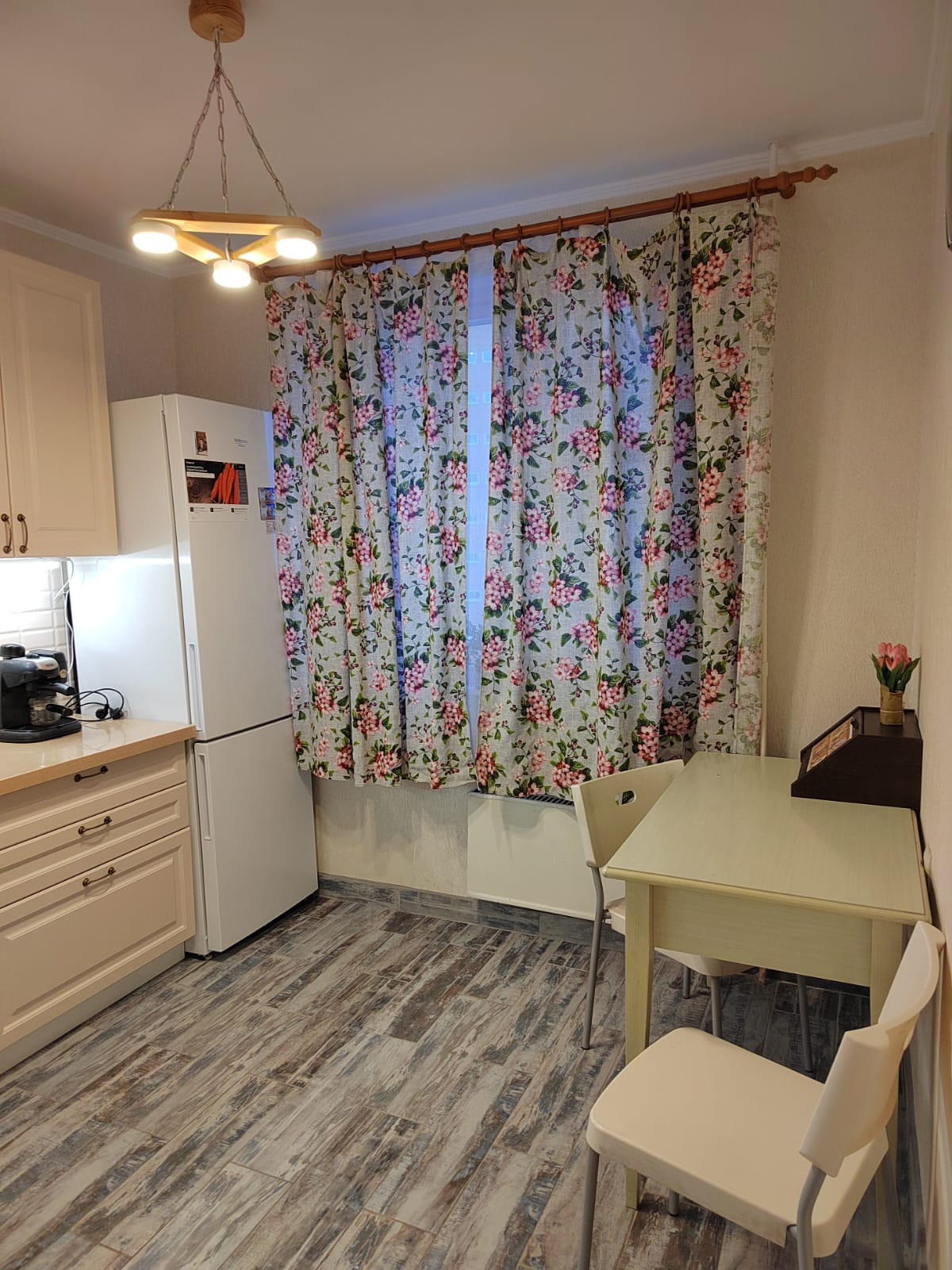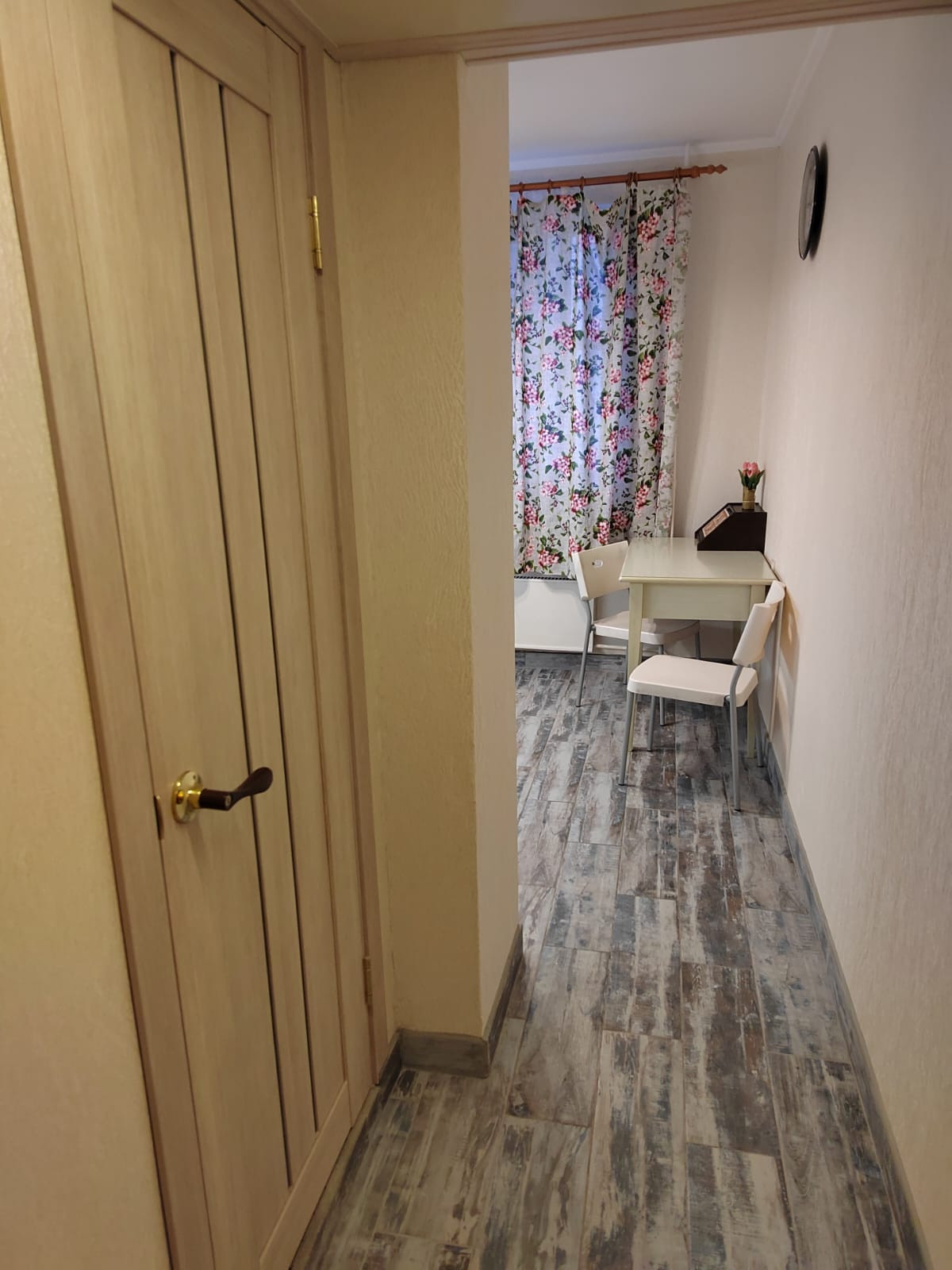 Ремонт был сделан в прошлом году. На кухне новый стильный встроенный гарнитур под единой столешницей. Полы кухня и прихожая - плитка.
