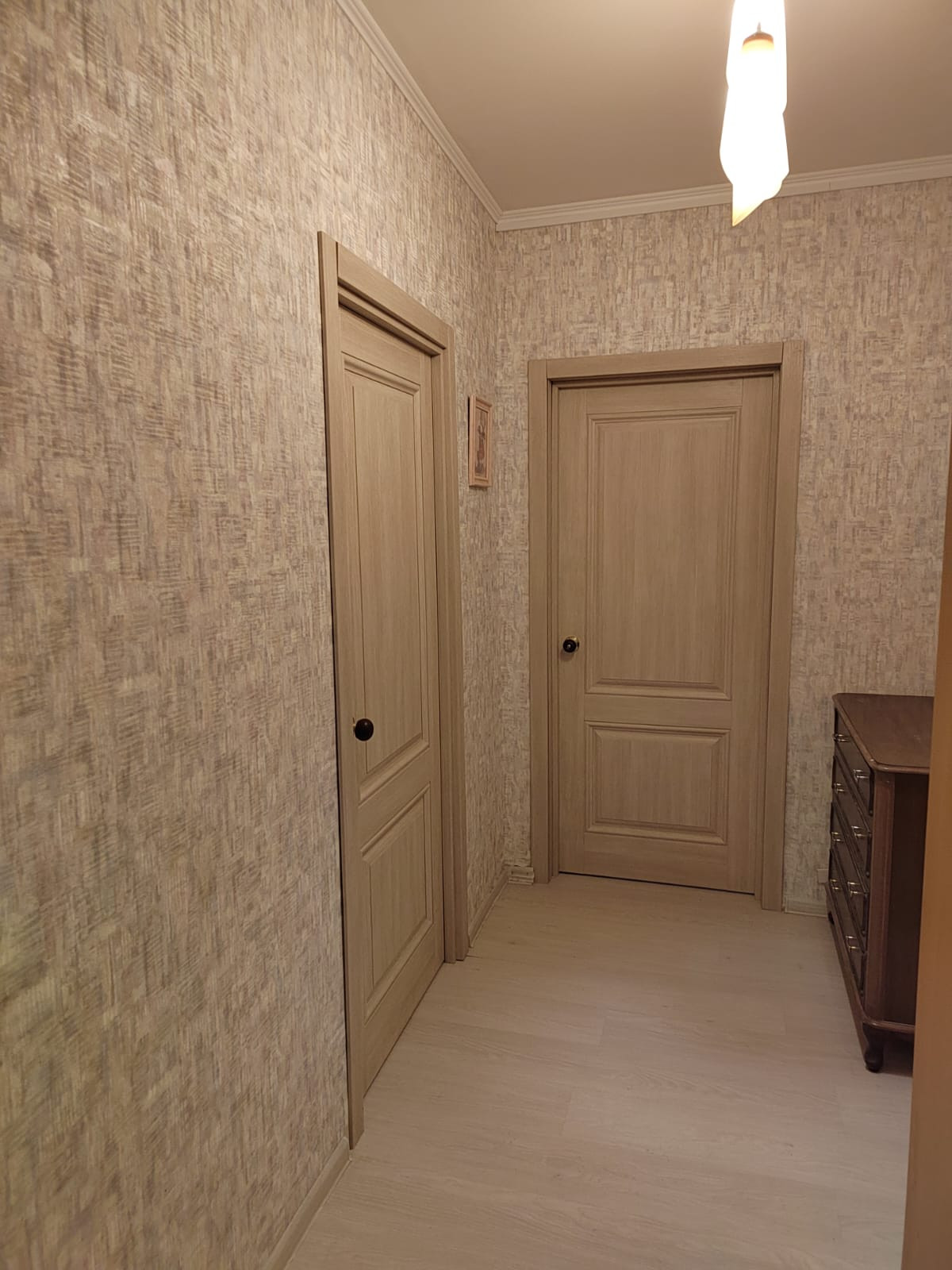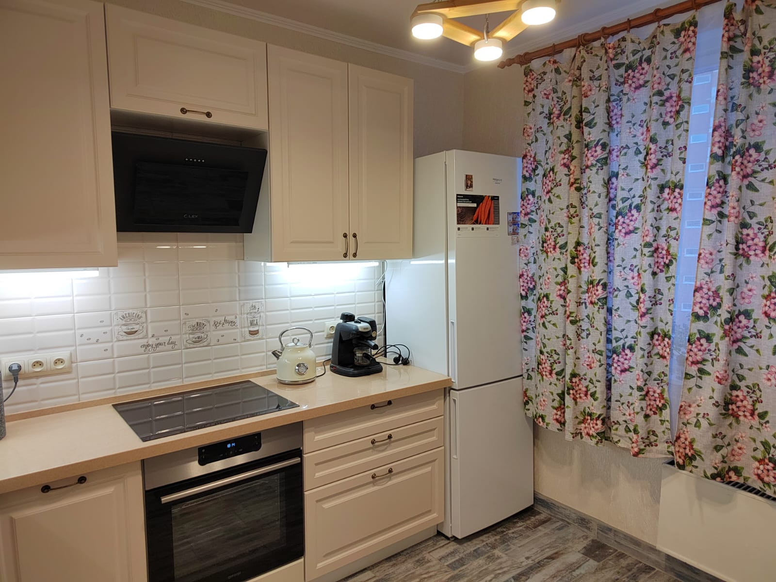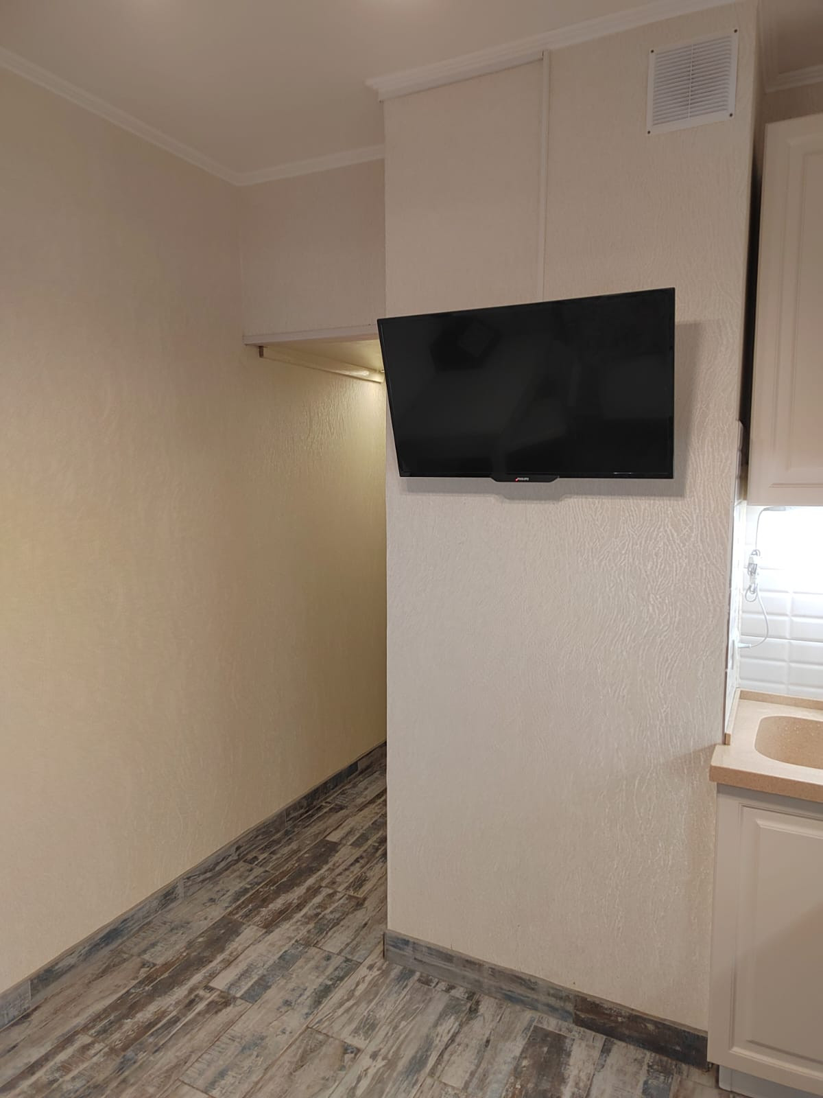 Ремонт был сделан в прошлом году. На кухне новый стильный встроенный гарнитур под единой столешницей. Полы кухня и прихожая - плитка.