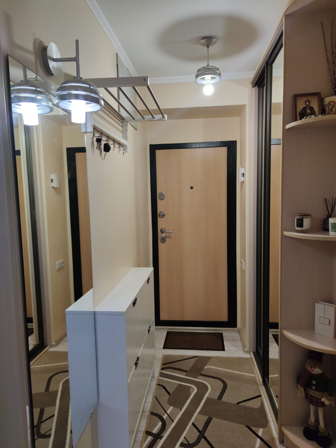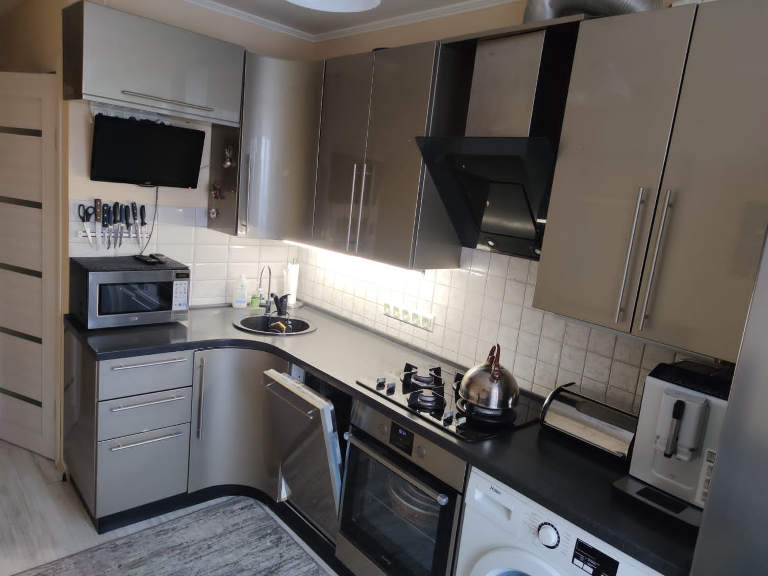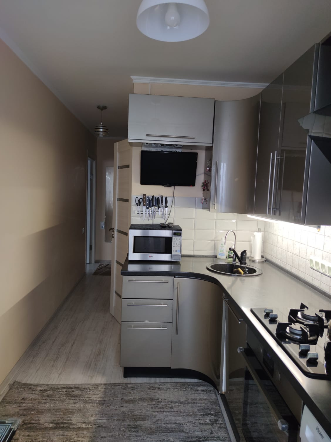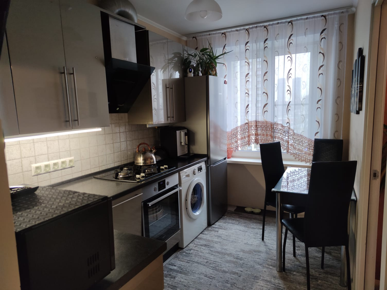 В комнате и прихожей вместительные шкафы-купе, стол на кухне со стеклянной светящейся поверхностью.