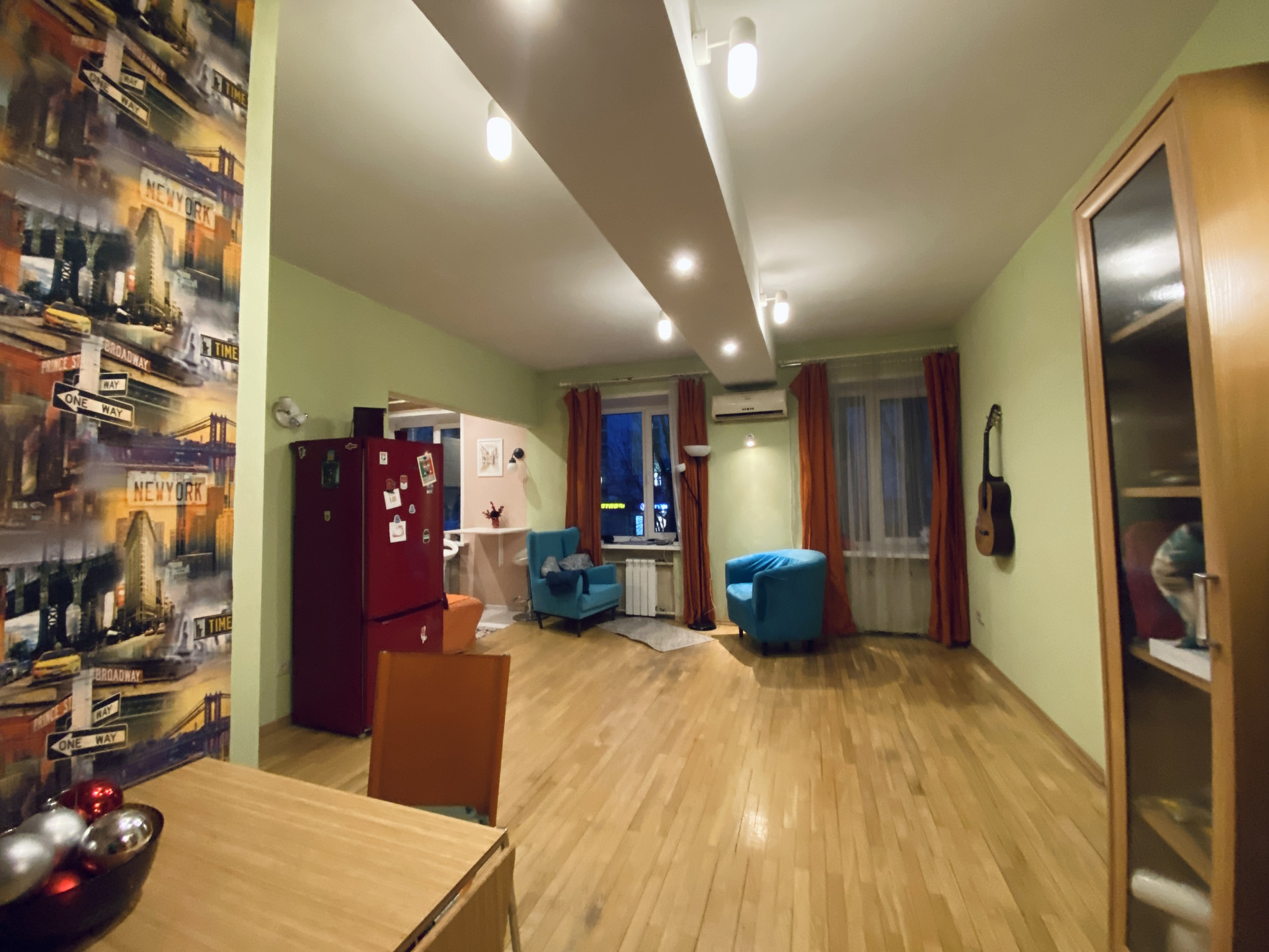 Гостиная -кухня устроена интересным способом: есть зона кухни со встроенным гарнитуром, всей необходимой техникой, барным столиком с высокими стульями, где хозяйка будет чувствовать себя уютно и иметь возможность во время приготовления ужина присесть с чашечкой кофе и подумать о прекрасном, а вторая зона этого пространства устроена как гостиная -с диваном, уютными креслами и обеденным столом со стульями. Таким образом, пространство объединяет две разные атмосферы, которые при желании соединяются вместе.