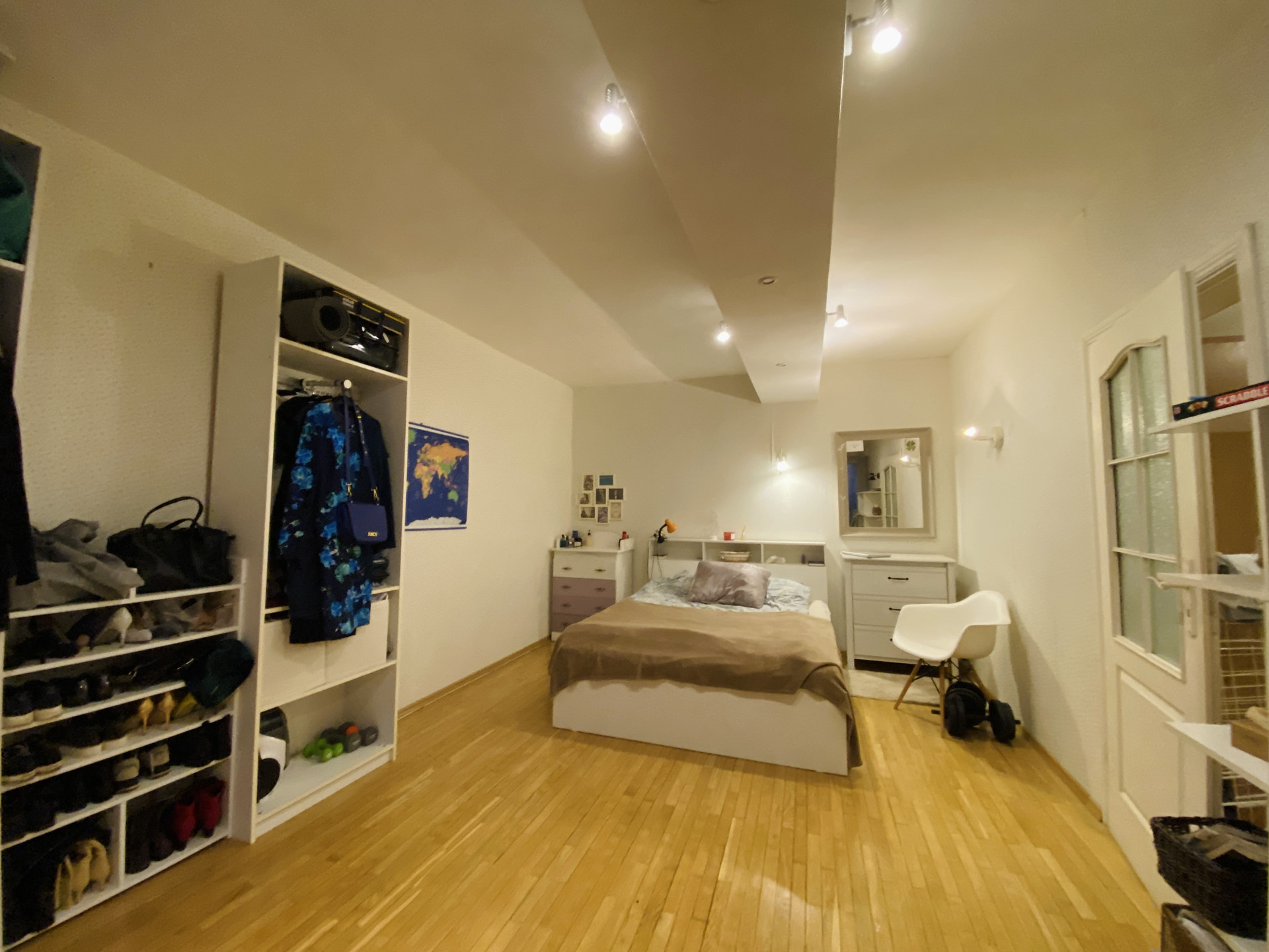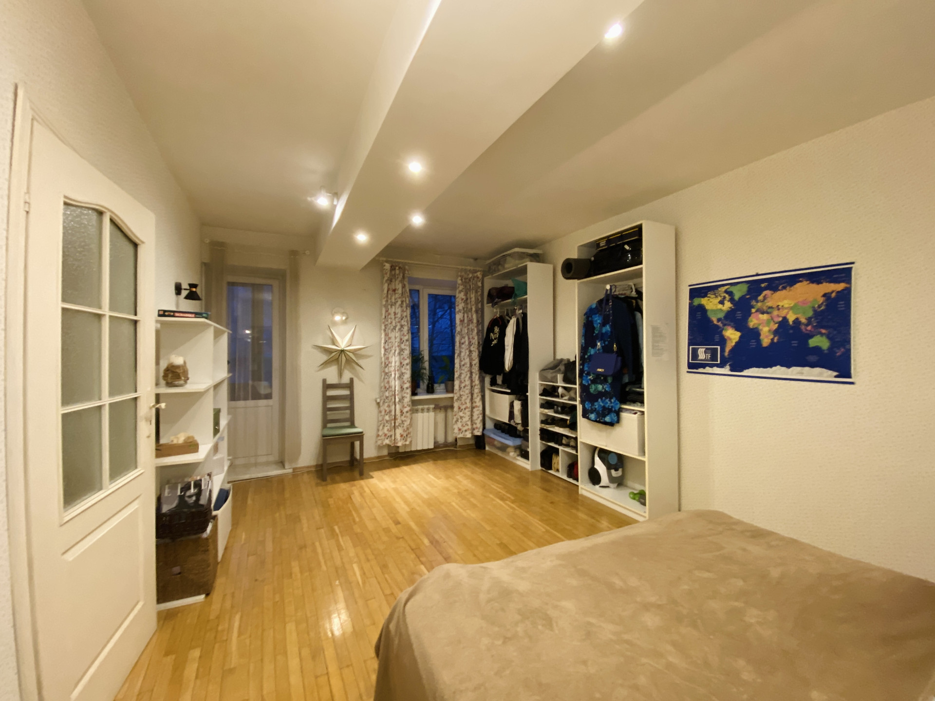 Из гостиной открывается дверь в изолированную комнату площадью 16 кв.м. с балконом, где можно уединиться и обустроить там зону отдыха или хранить личные вещи. В комнате очень уютно: двуспальная кровать, шкаф для хранения вещей, прикроватные тумбочки, зеркало, окно с выходом на тихую улицу.