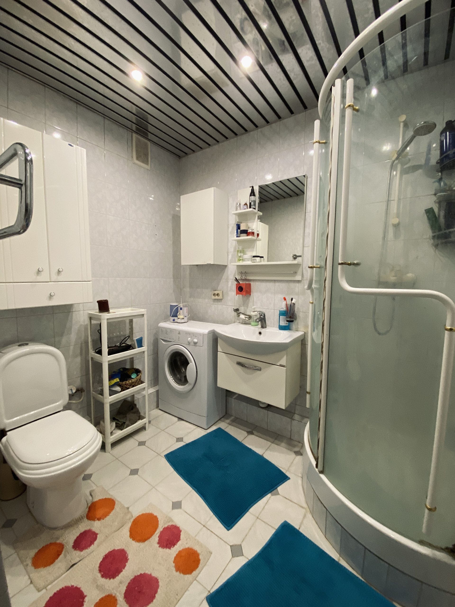 Санузел в квартире совмещенный, площадью 4 кв.м. Все устроено по самому удобному расположению: душевая кабина размера XL, шкафчики для хранения вещей и белья, раковина со тумбой.