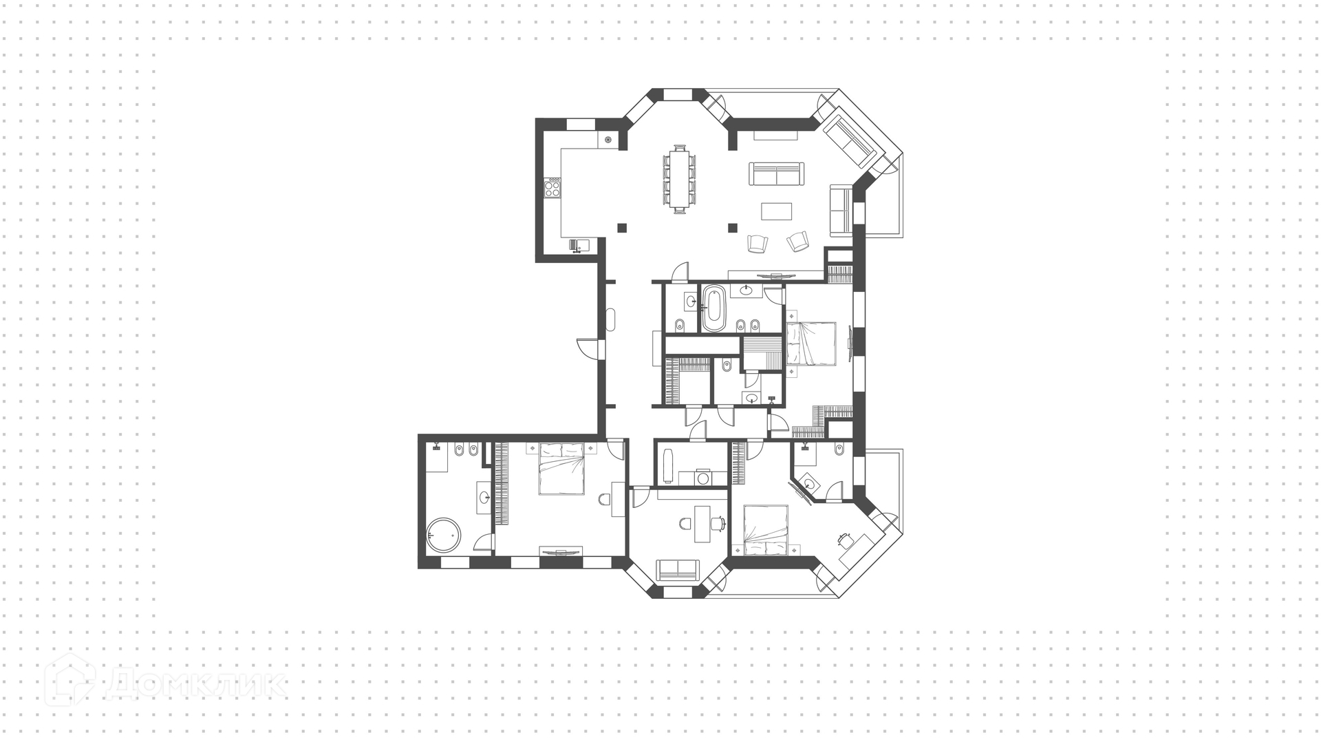 Планировка: большая гостиная, кухня-столовая, 4 спальни с санузлами и гардеробными, сауна, просторные холлы, постирочная, гостевой санузел, четыре лоджии. Потолки высотой 3,2 метра, большие панорамные окна с двухкамерными энергосберегающими стеклопакетами максимизируют количество света и придают дополнительный объём. Открываются виды на четыре стороны света — на «Москва-Сити», городские пейзажи и в благоустроенный двор.