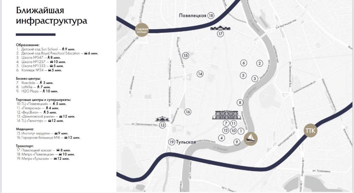 В радиусе 3 км. находятся Даниловский рынок, ТЦ Павелецкая Плаза.