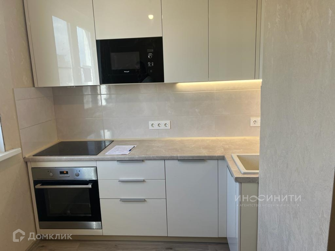 Новая кухня изготовлена по индивидуальному проекту компанией "Кухонный двор" со встроенной техникой - индукционная плита и духовка Electrolux, посудомоечная машина Bosch, вытяжка,  микроволновая печь, холодильник LG, стиральная машина с сушкой LG. Смеситель имеет отдельный кран на фильтр.