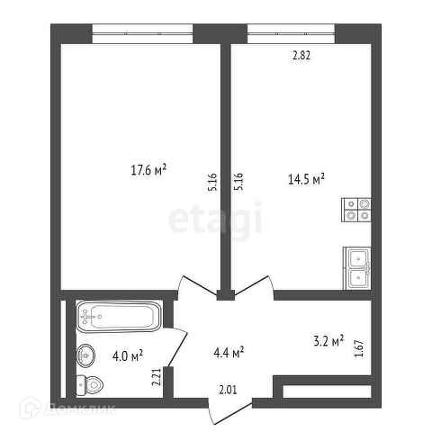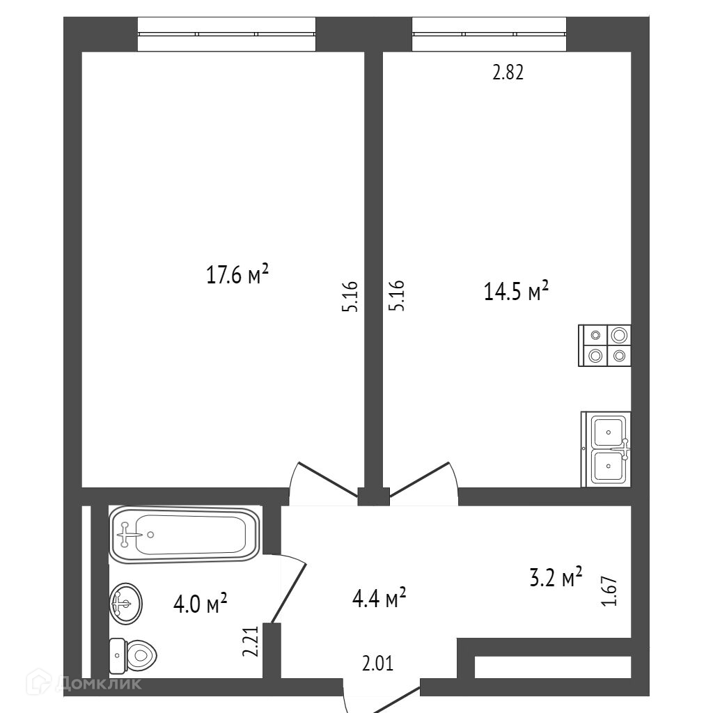 Квартира без ремонта, можно воплотить в жизнь свои дизайнерские решения. Площадь 43,7 кв. м. достаточно для просторной кухни-гостиной и уютной спальни.