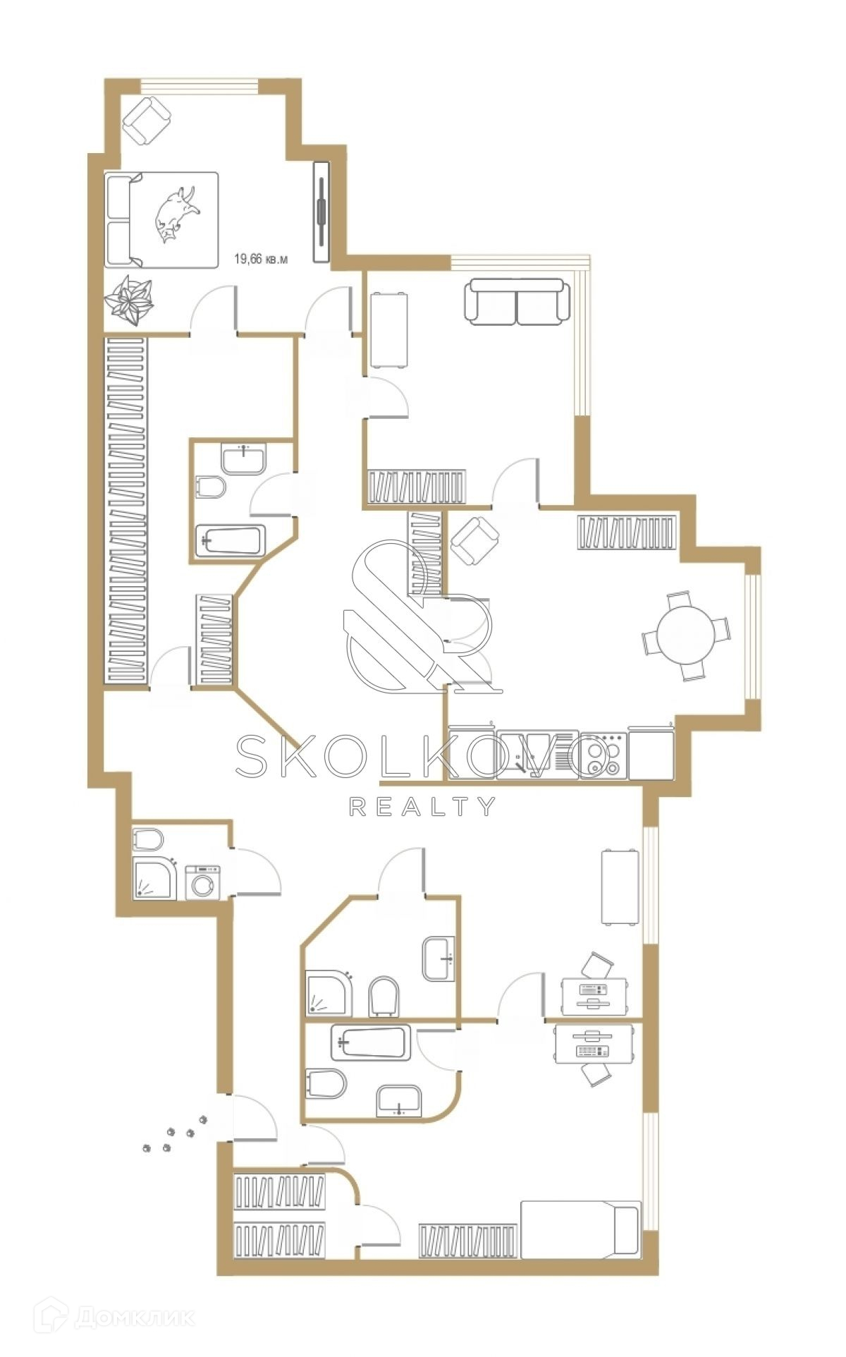 Пространство квартиры организовано максимально комфортно: мастер-спальня с санузлом и гардеробной комнатой, кабинет, кухня, объединенная с гостиной, гостевой санузел. Продается без мебели. Установлены кондиционеры и сигнализация. Обустроен балкон. В квартире потолки высотой 3,15 метров. На окнах двойной стеклопакет с тройным остеклением.