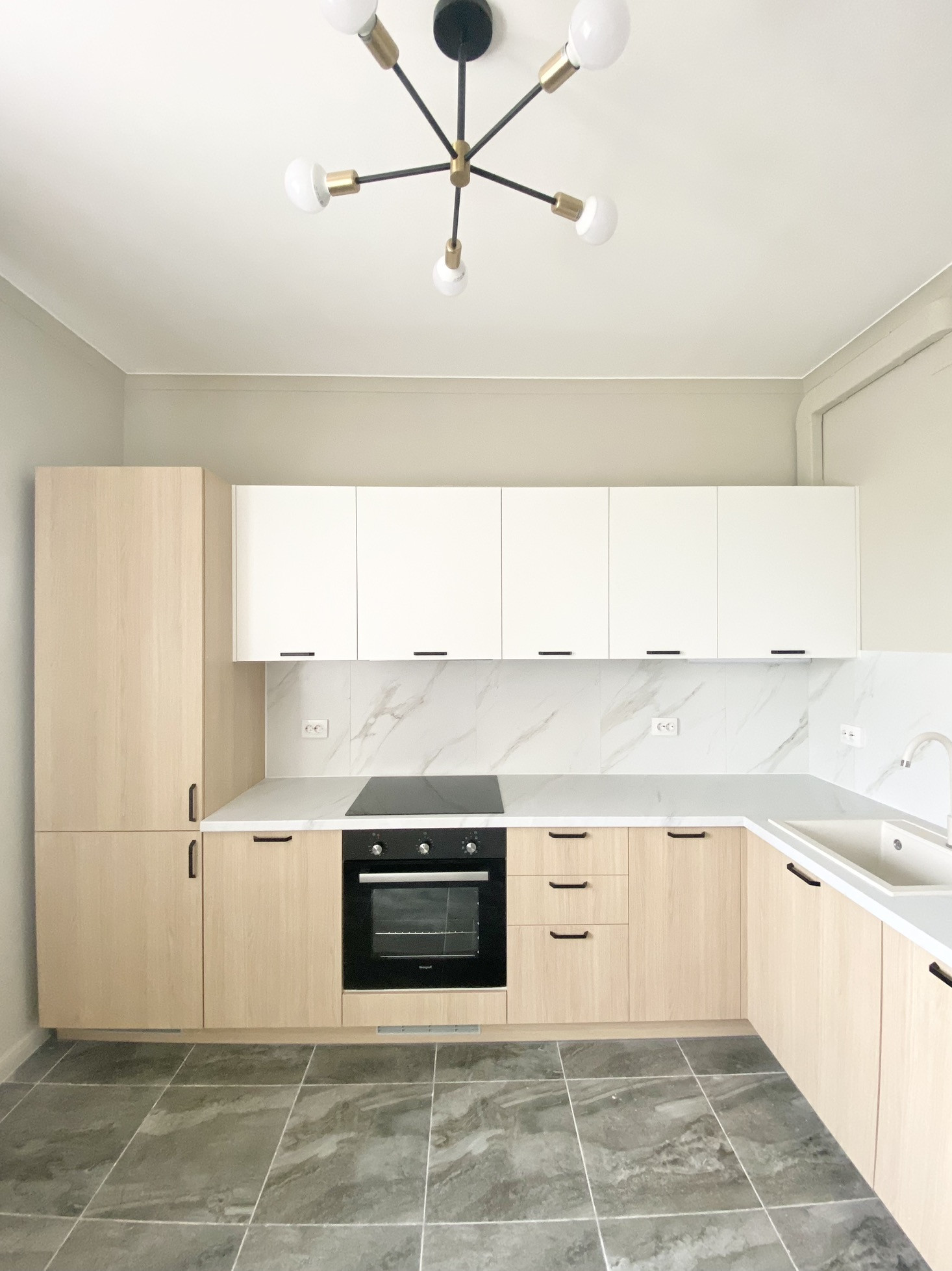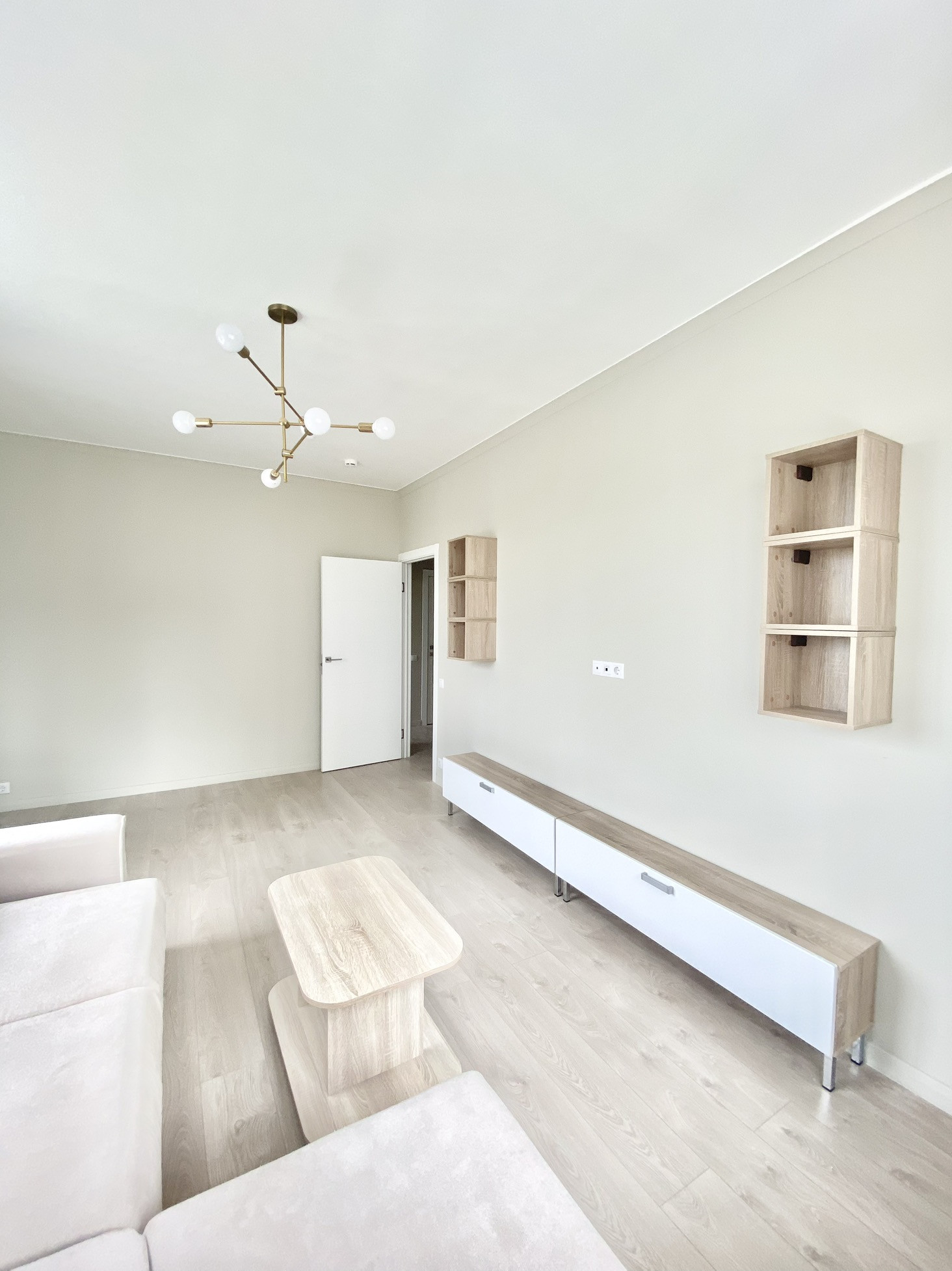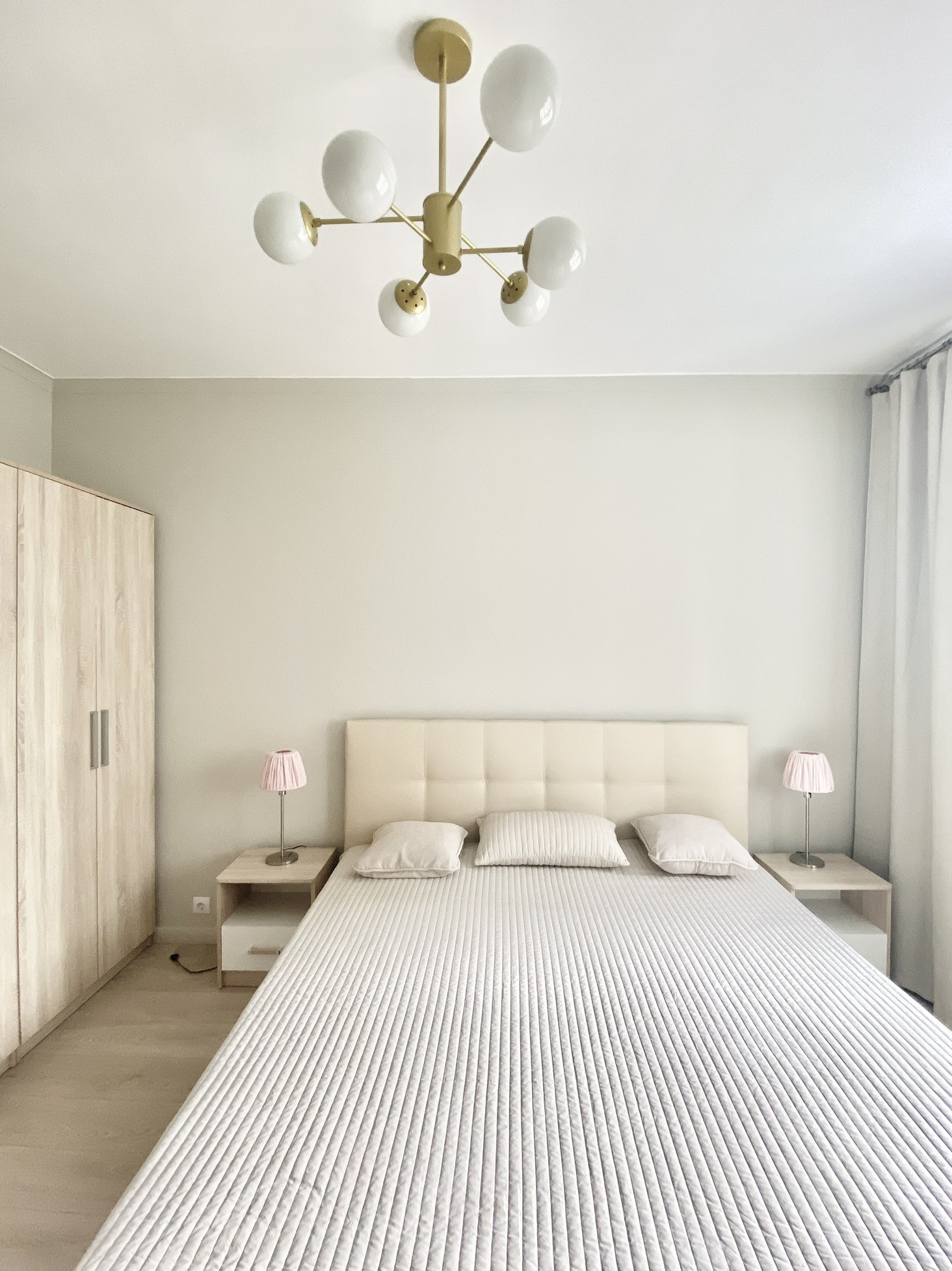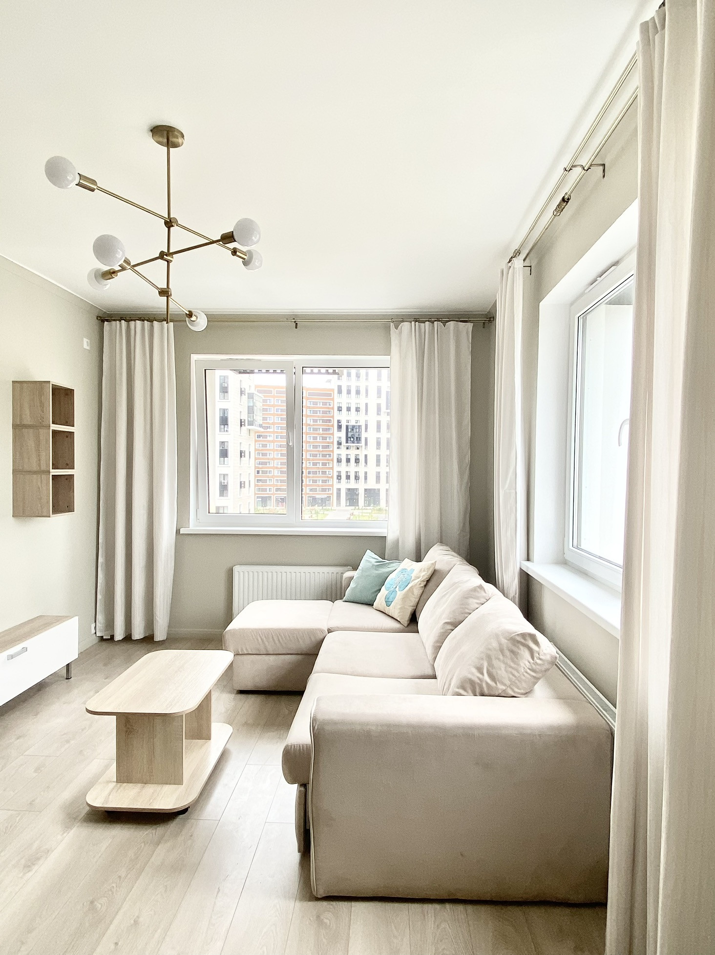 Состав мебели: кухонный фронт, бытовая техника (стиральная машина, ПММ, духовка, варочная панель, вытяжка, холодильник), вся сантехника, мебель в санузлах, шкафы в обеих спальнях, двуспальная кровать с матрасом и подъемным механизмом, прикроватные тумбочки, угловой диван 2,4*1.7, мебельная стенка в гостиной, шкаф в прихожей, 2 обувницы, рабочий стол и стул, обеденный стол и стулья на кухне, люстры и светильники, зеркала, шторы.