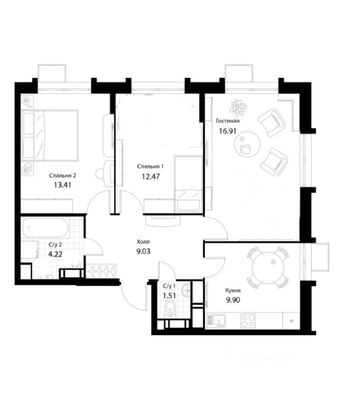 Отличная планировка. Две спальни, гостиная и кухня изолированные с дверьми, просторная прихожая, 2 санузла: ванная и туалет.