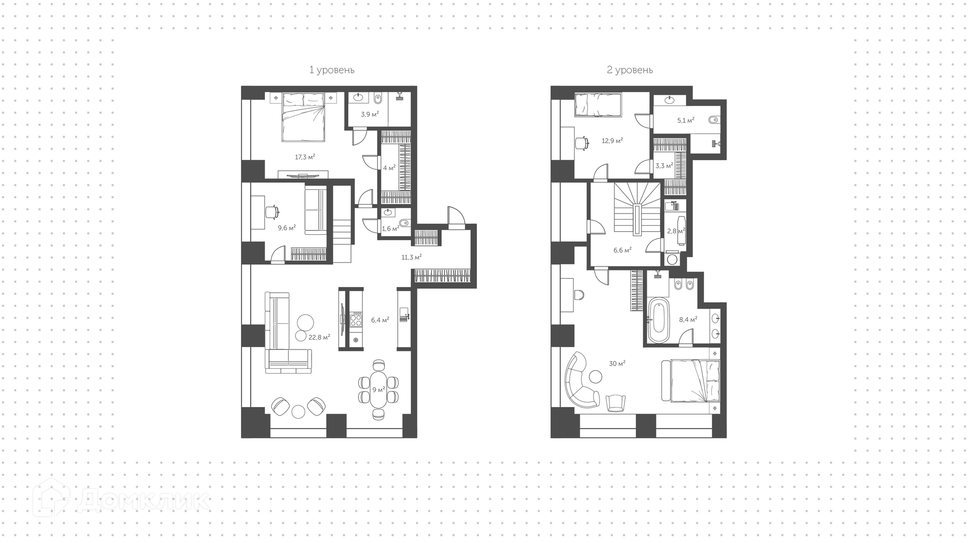 На 1-м уровне расположена просторная кухня-гостиная, которая станет любимым местом для семейных ужинов и киносеансов. Первая мастер-спальня и изолированная рабочая зона с панорамным остеклением, вдохновляйтесь на новые свершения, любуясь живописными пейзажами города.  На 2-м уровне организовано 2 мастер-спальни.