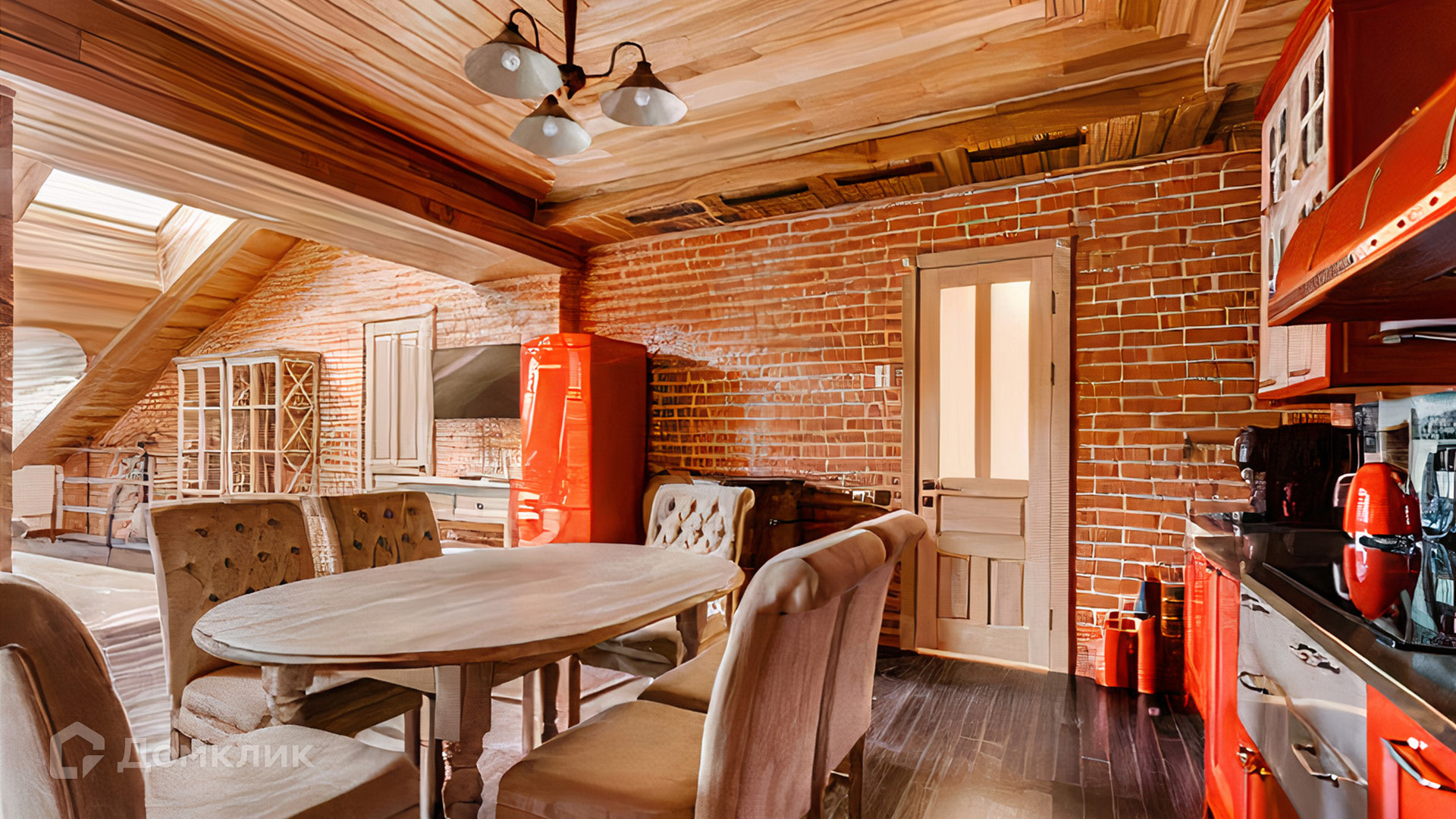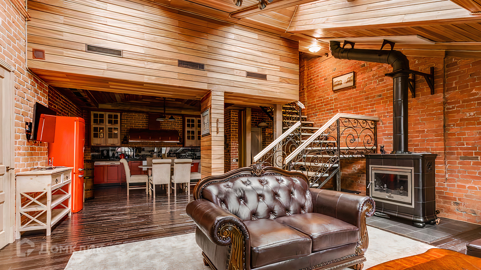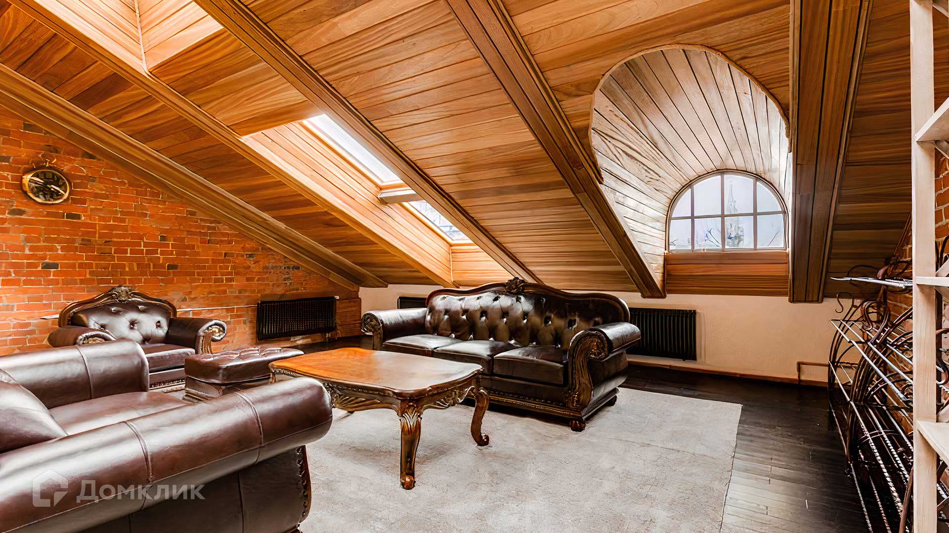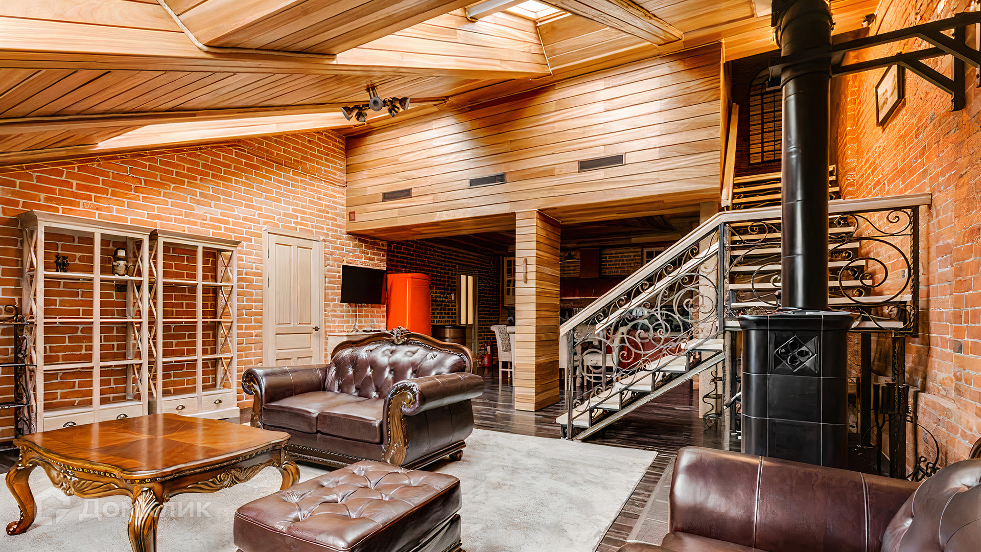 ID 196 970. Двухуровневый апартамент площадью 157 м² в клубном доме «Кадашевские Палаты» в центре Москвы. Выполнен дизайнерский ремонт в стиле «лофт». В отделке использовано натуральное дерево, красный кирпич и элементы из тёмного металла. На полу выложен паркет и постелены уютные ковры. Потолки высотой от 3,5 до 5 метров в сочетании с мансардными окнами наполняют помещение светом.