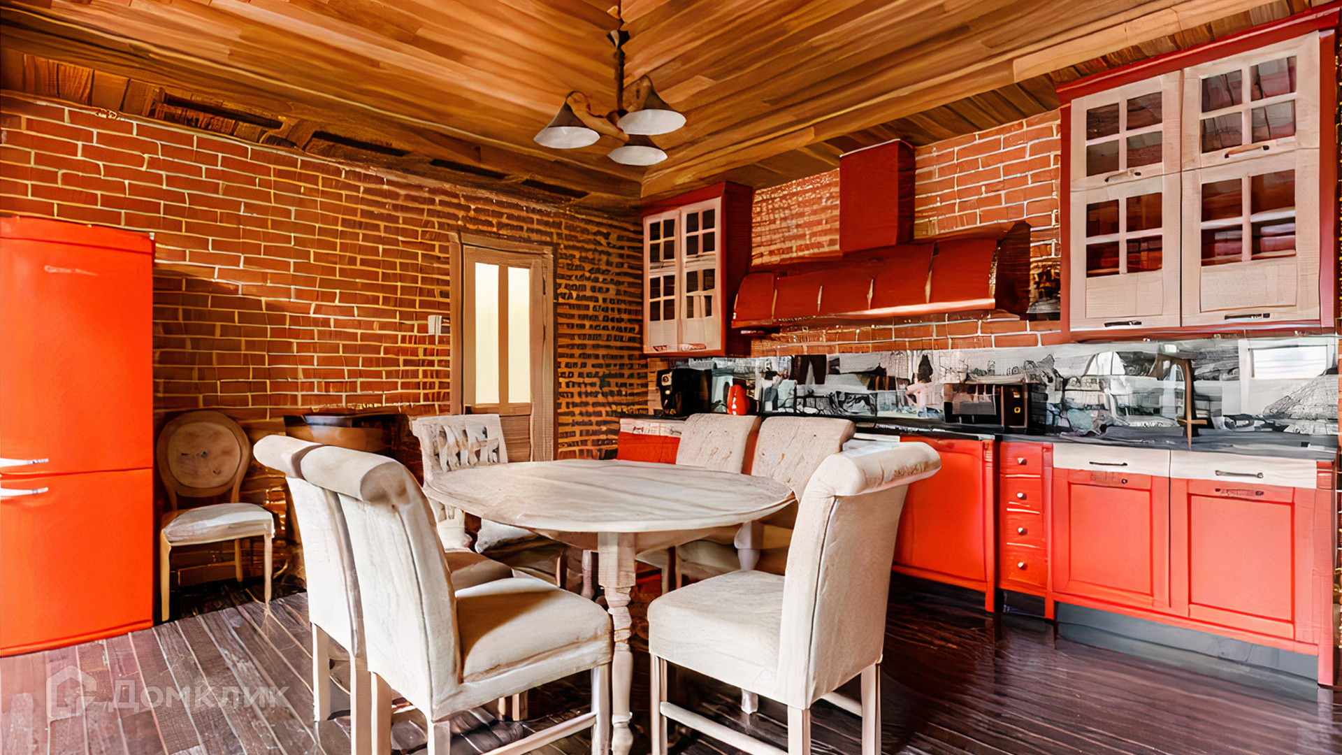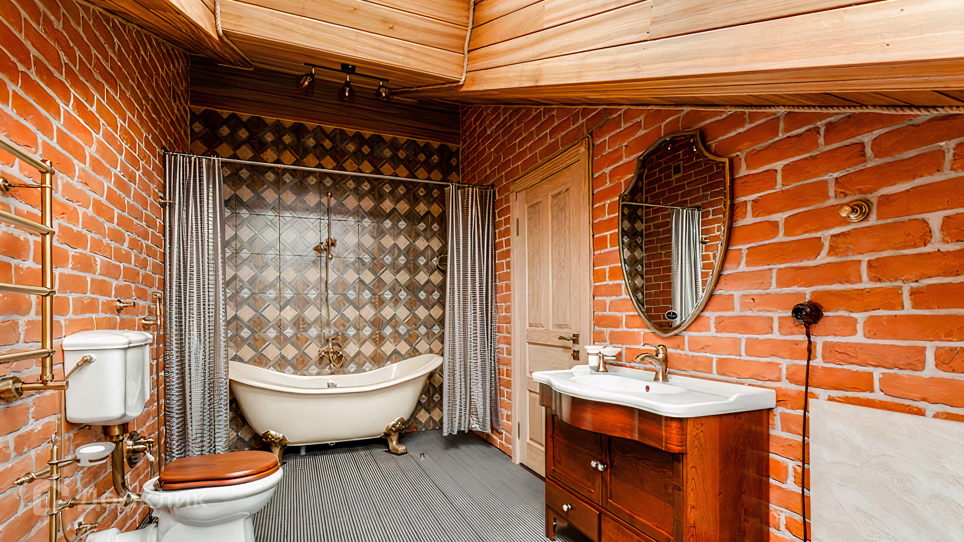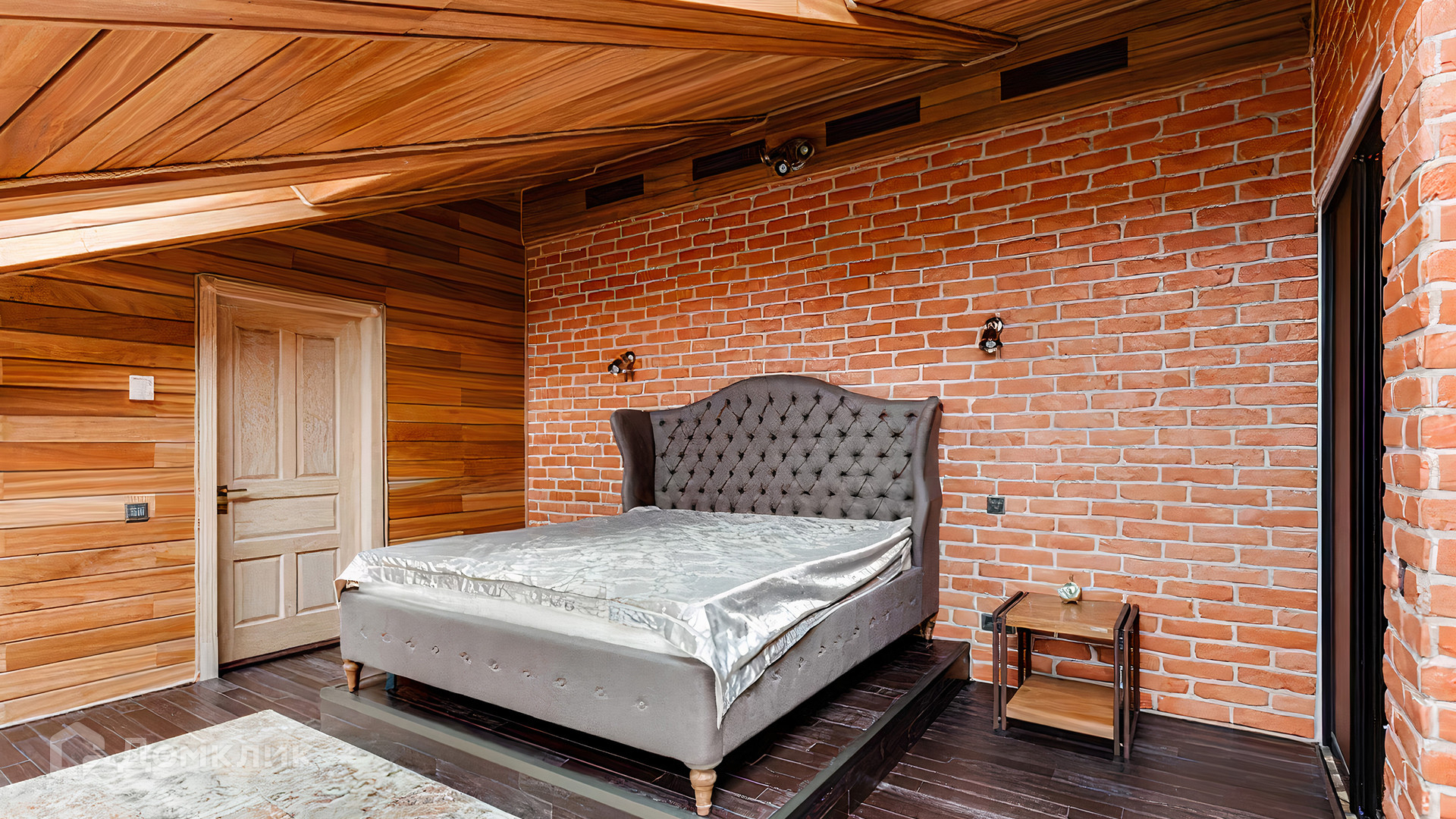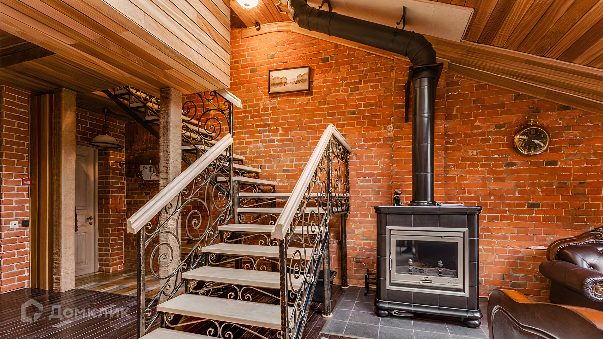 ID 196 970. Двухуровневый апартамент площадью 157 м² в клубном доме «Кадашевские Палаты» в центре Москвы. Выполнен дизайнерский ремонт в стиле «лофт». В отделке использовано натуральное дерево, красный кирпич и элементы из тёмного металла. На полу выложен паркет и постелены уютные ковры. Потолки высотой от 3,5 до 5 метров в сочетании с мансардными окнами наполняют помещение светом.