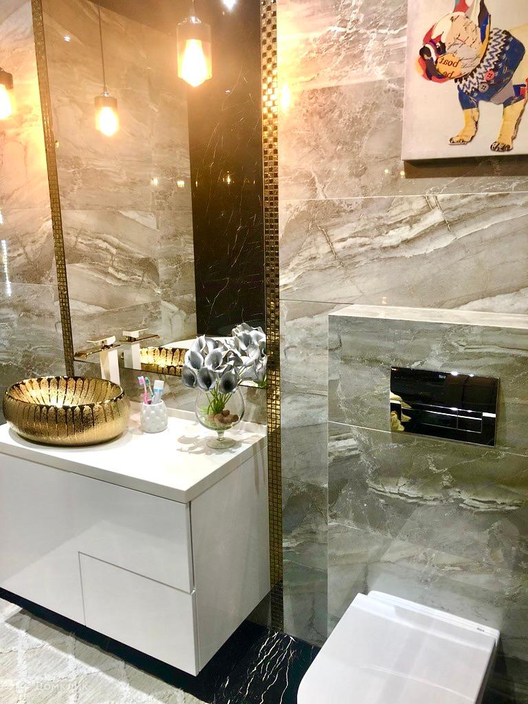 Ванная комната полностью из итальянского керамогранита, ванна из литьевого мрамора. Также, в комнате установлен теплый пол и есть различные варианты подсветки/света.