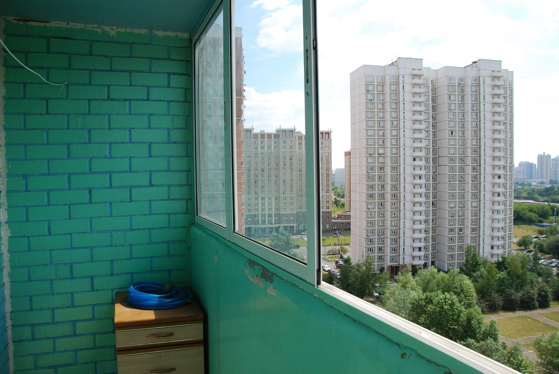 Большая застекленная лоджия 3.3 кв.м. Общая площадь с лоджией 40.8 кв.м. Окна выходят на солнечную сторону на юго-запад.