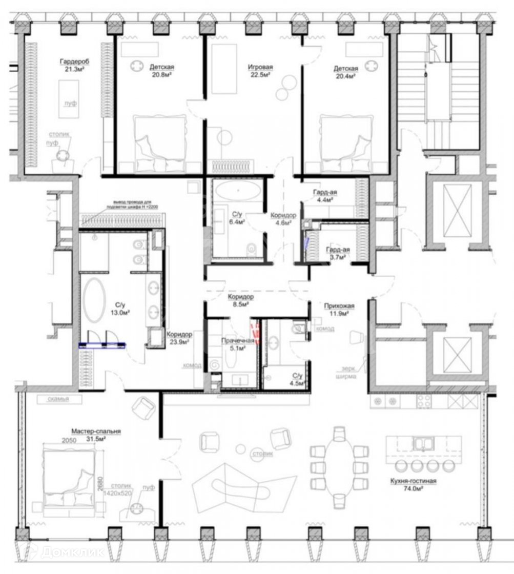Функциональная и разумная планировка. Гостиная-столовая объединена с кухней, мастер-спальня со своим санузлом, кабинет, гардеробная, 2 детские комнаты, игровая комната, гостевой санузел, кладовая-постирочная.