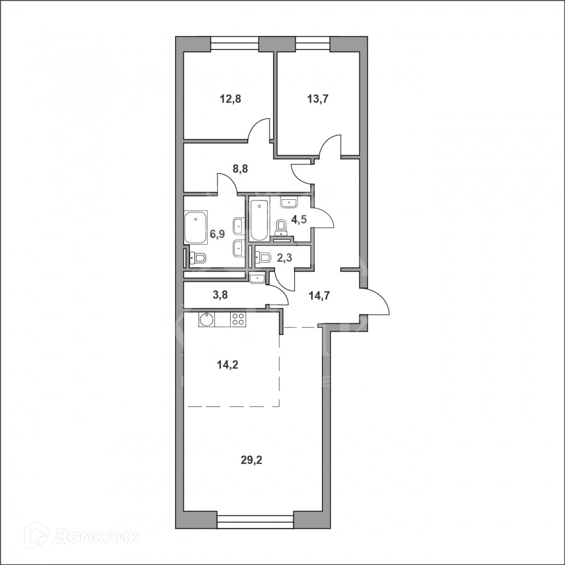 Можно спланировать: кухня-гостиная, две спальни, постирочная, два с/у.