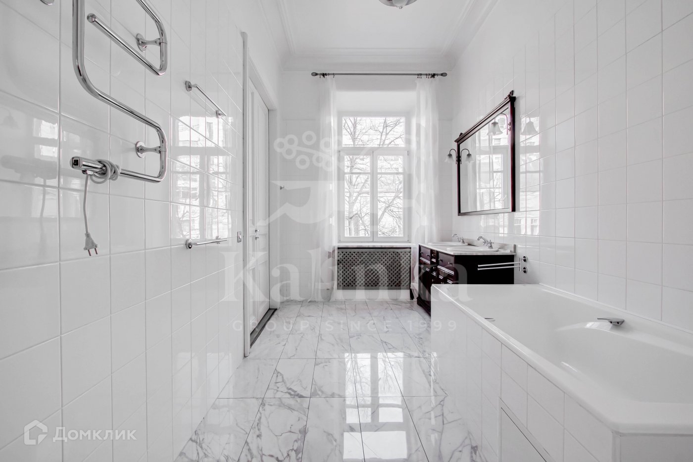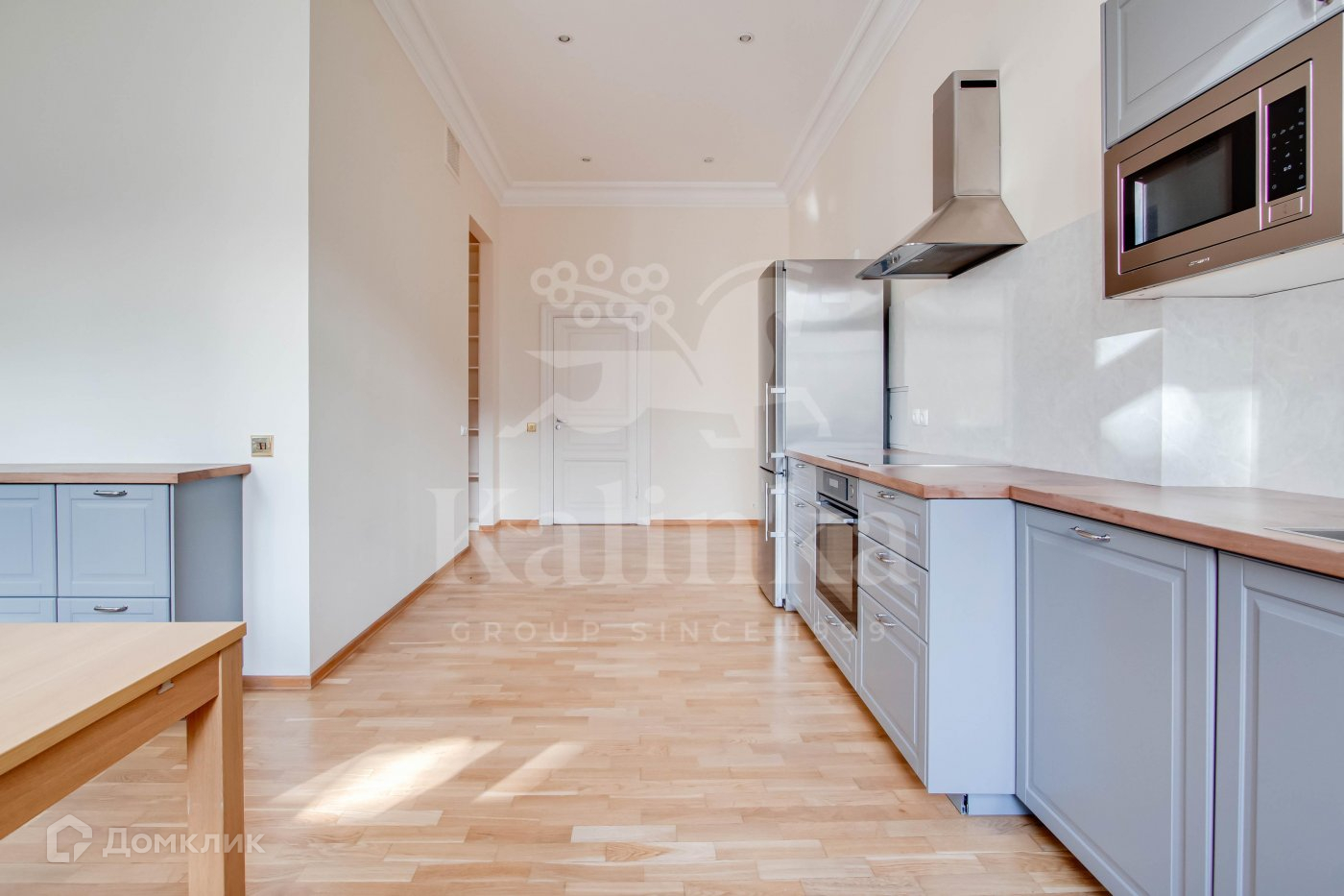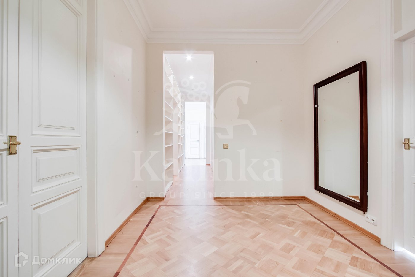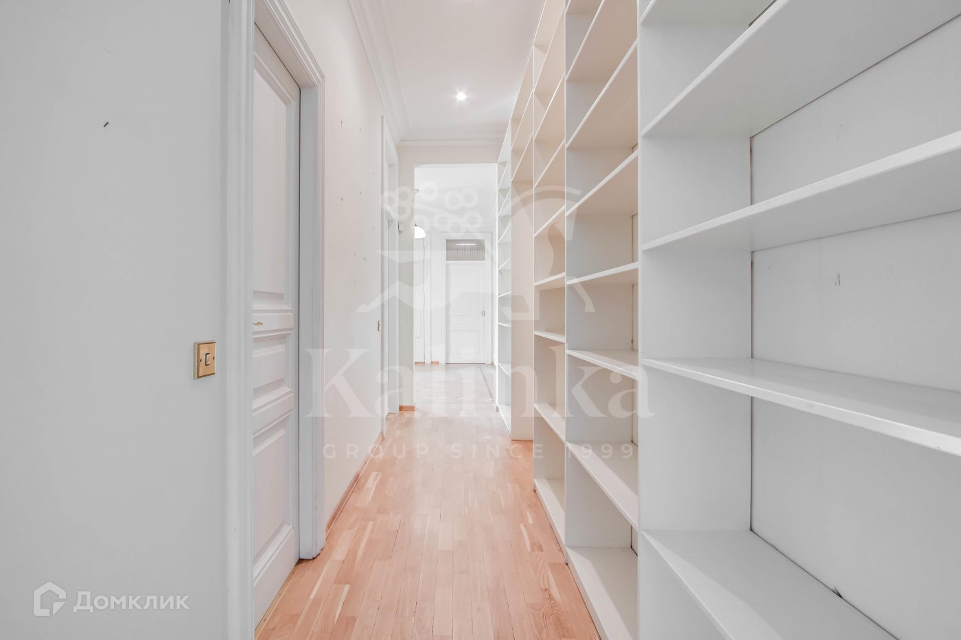 Многокомнатная квартира в историческом доме в Хамовниках. Планировка включает в себя кухню-столовую, кабинет, гостиную, три спальни и одну мастер-спальню, постирочную, гардеробные и три ванные комнаты. В квартире предусмотрено два входа. Железобетонные перекрытия, стены толщиной 1,1 метра, высота потолков 3,4 метра.