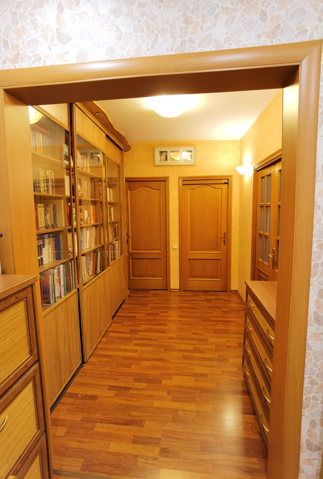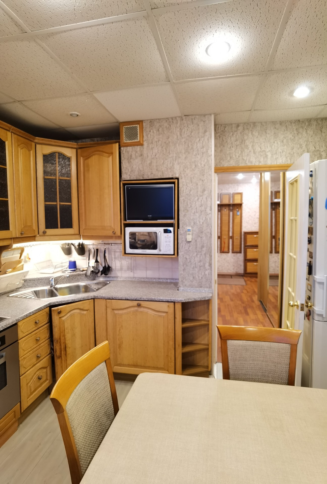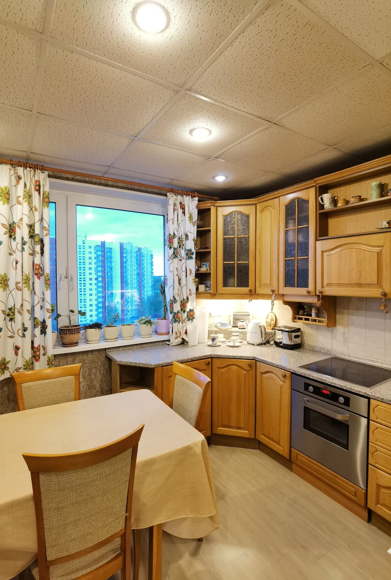 Общая площадь с учетом лоджий 78,9 кв.м., без учета - 73,5 кв.м. Квартира в жилом состоянии. Одна большая лоджия 4,4 кв.м. застекленная, вторая лоджия 1 кв.м. так же с остеклением. Пластиковые стеклопакеты. Перепланировок нет. Встроенная деревянная кухня с духовым шкафом, варочной панелью и посудомоечной машиной остаются.