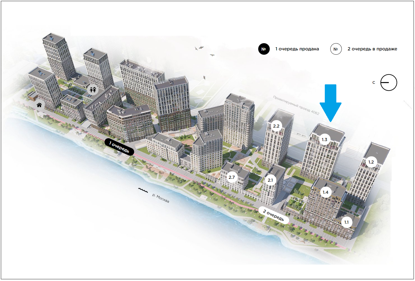 Квартира на ходится на первом этаже в корпусе 1.3. Со стороны Проектируемого проезда квартира находится на уровне второго этажа. Окна выходят во двор и в сторону корпуса 2.2;