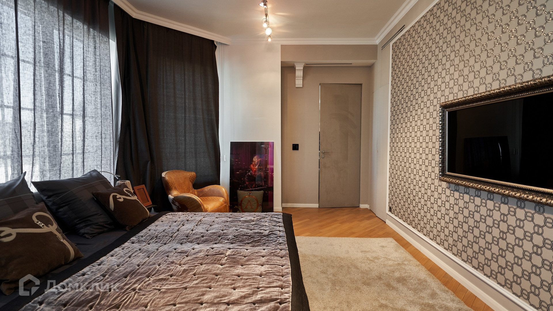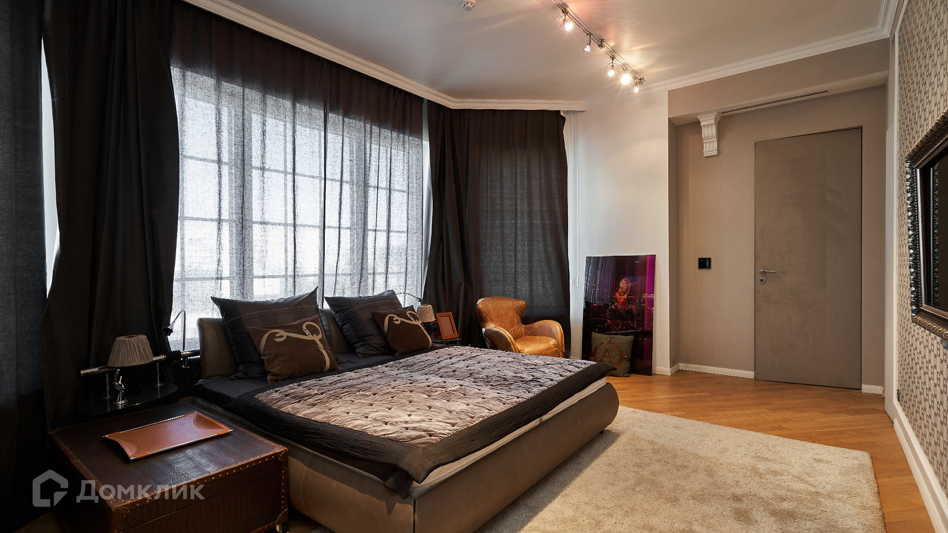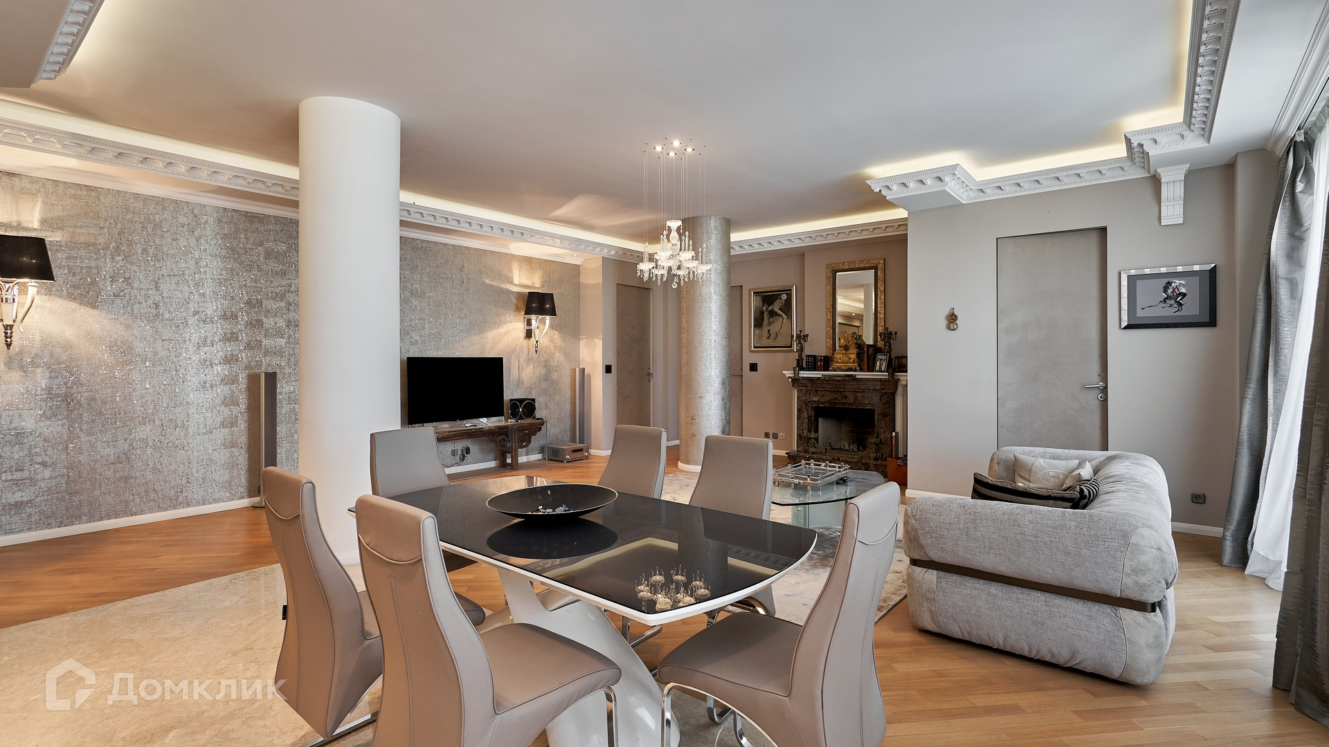 ID 144 913. Просторная квартира с 2-мя спальнями и действующим камином в клубном доме «Агаларов Хаус». Выполнен дизайнерский ремонт в современном стиле. На полу выложен водонепроницаемый паркет, ковры, двери обшиты алькантарой. Светлые стены украшены картинами и зеркалами, потолок с подсветкой по периметру. Установлена мебель Fendi, в душевой кабине телевизор и Surround Sound.