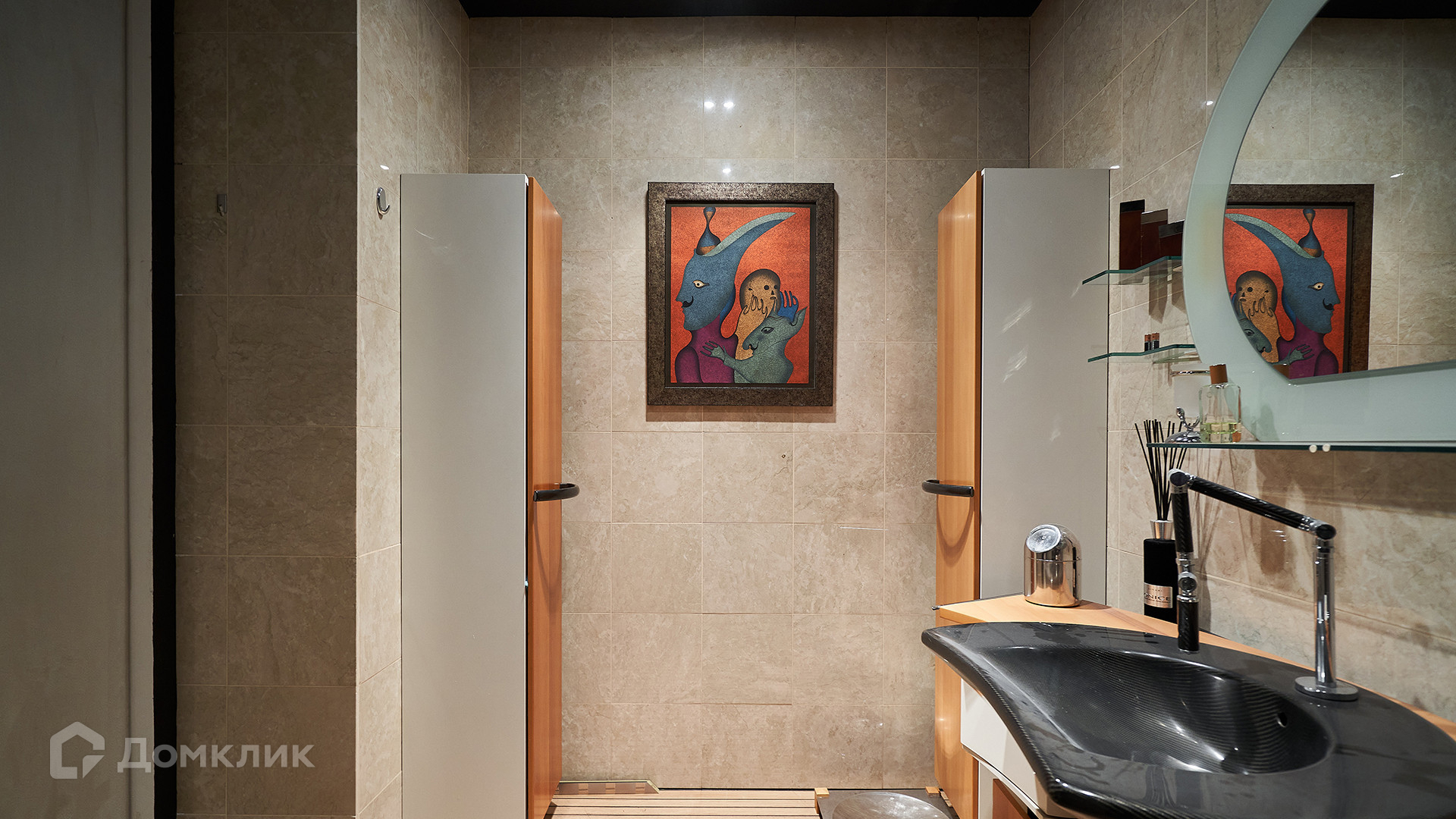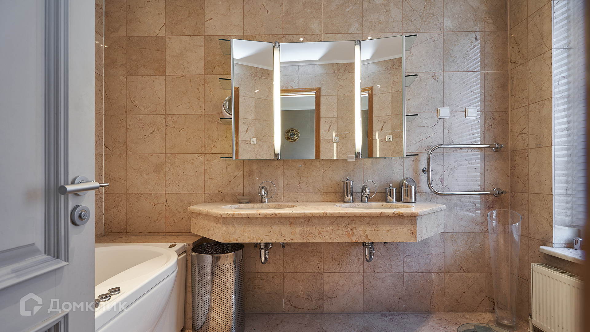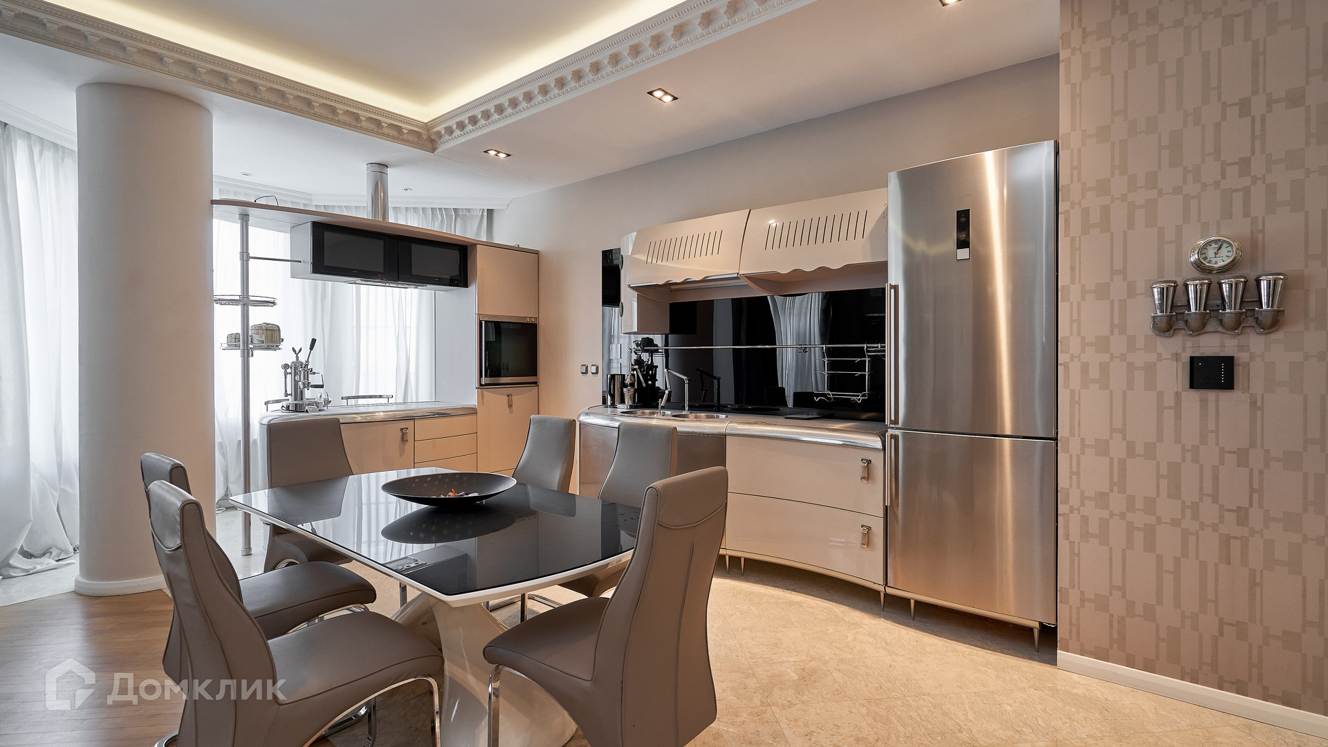 ID 144 913. Просторная квартира с 2-мя спальнями и действующим камином в клубном доме «Агаларов Хаус». Выполнен дизайнерский ремонт в современном стиле. На полу выложен водонепроницаемый паркет, ковры, двери обшиты алькантарой. Светлые стены украшены картинами и зеркалами, потолок с подсветкой по периметру. Установлена мебель Fendi, в душевой кабине телевизор и Surround Sound.