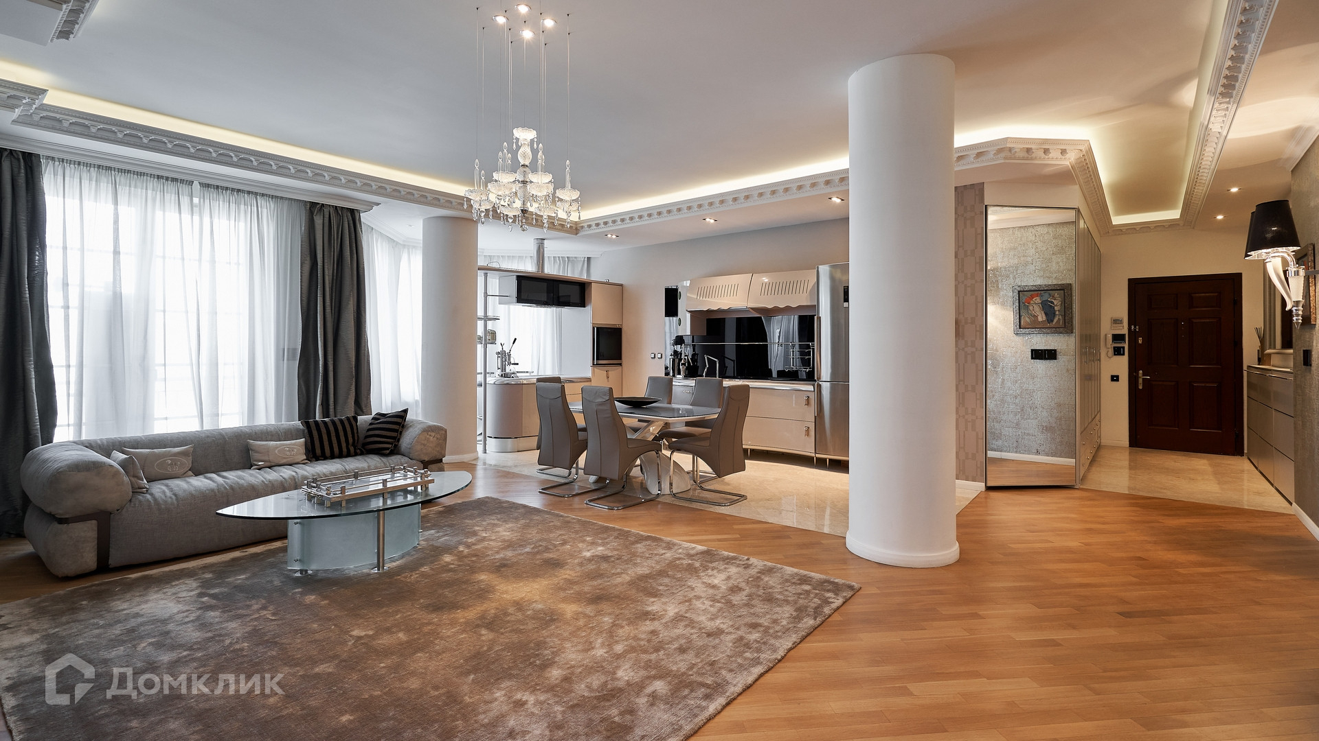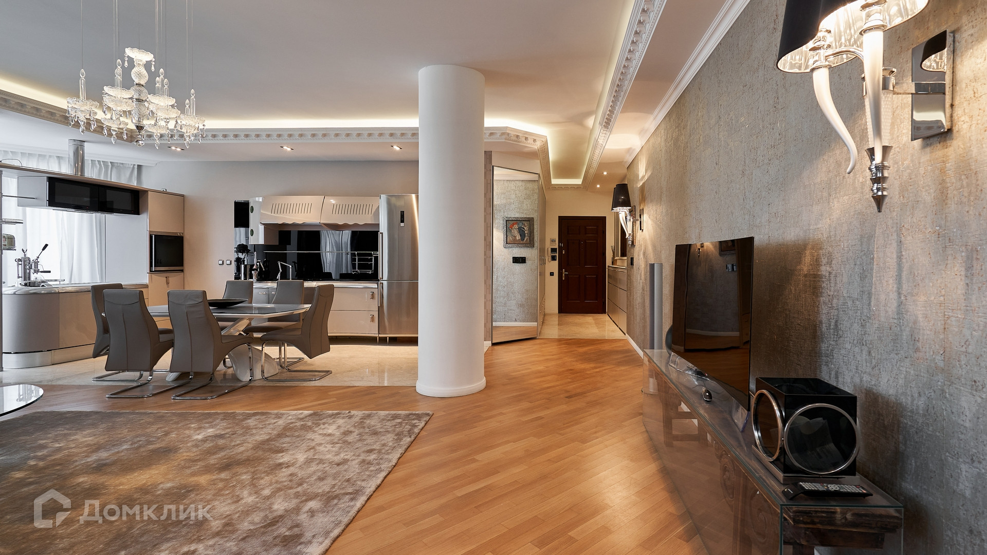 Планировка: гостиная с зоной кухни, 2 спальни, ванная комната, санузел. В гостиной оборудован камин, столовая зона на 6 персон, зона отдыха с мягким светлым диваном. Машиноместо в подземном паркинге в стоимость не входит.