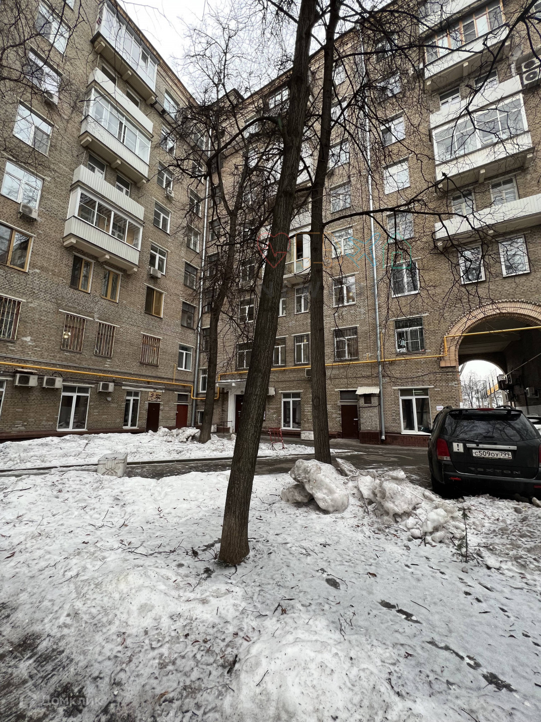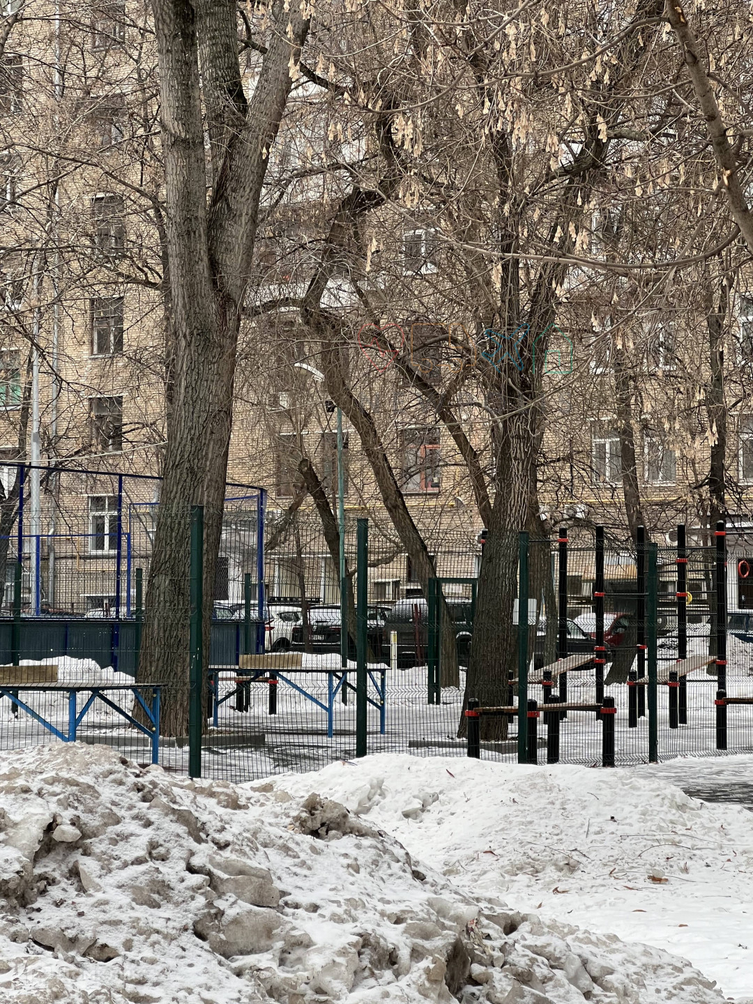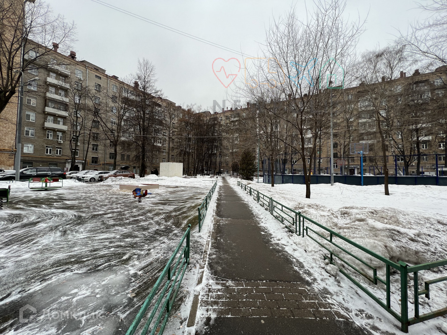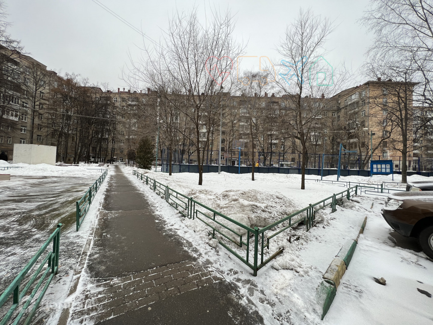 Во дворе - собственный сквер, каток, детская и спортивная площадки. Парковка за шлагбаумом.