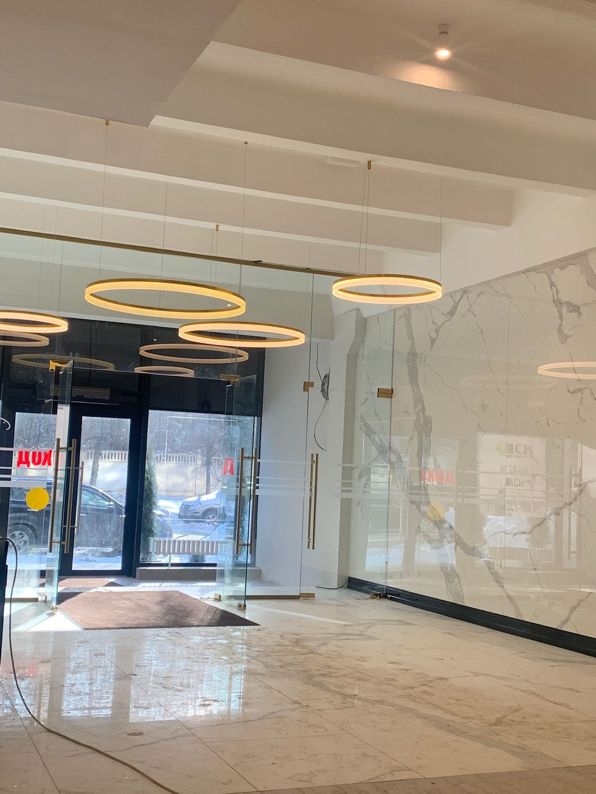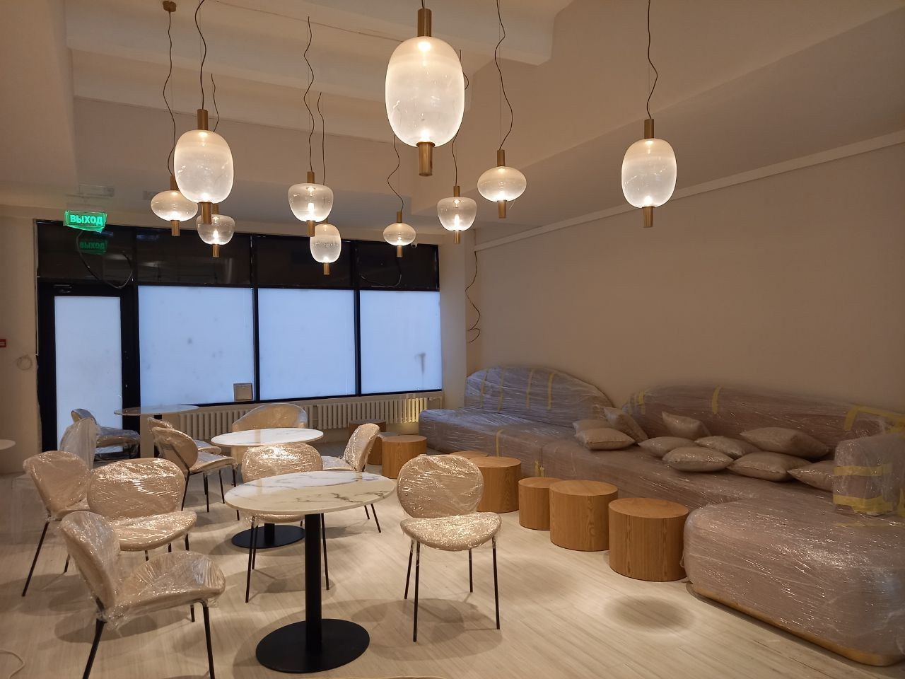 Входная группа состоит из фойе и лаунж зоны со столиками и мягкими диванами.