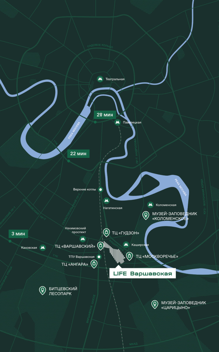 Пешая доступность от станции метро Варшавская, Каширская и ж/д станции Коломенское Павелецкого направления.