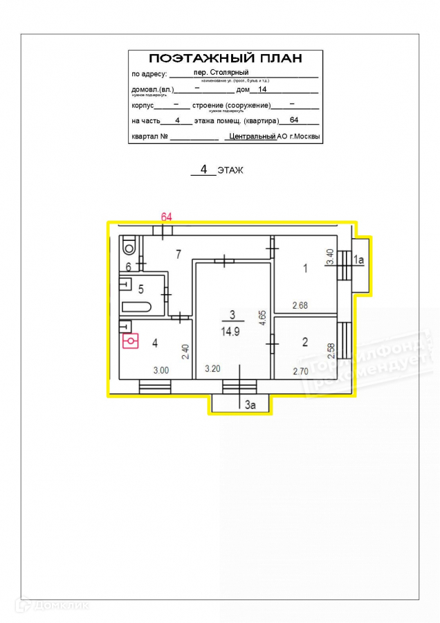 3-комнатная квартира, 53 м2, этаж 4 / 5, на продажу в Москве, Столярный переулок, 14