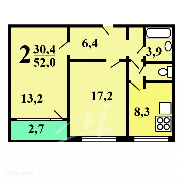 Общая площадь 52.2 м2