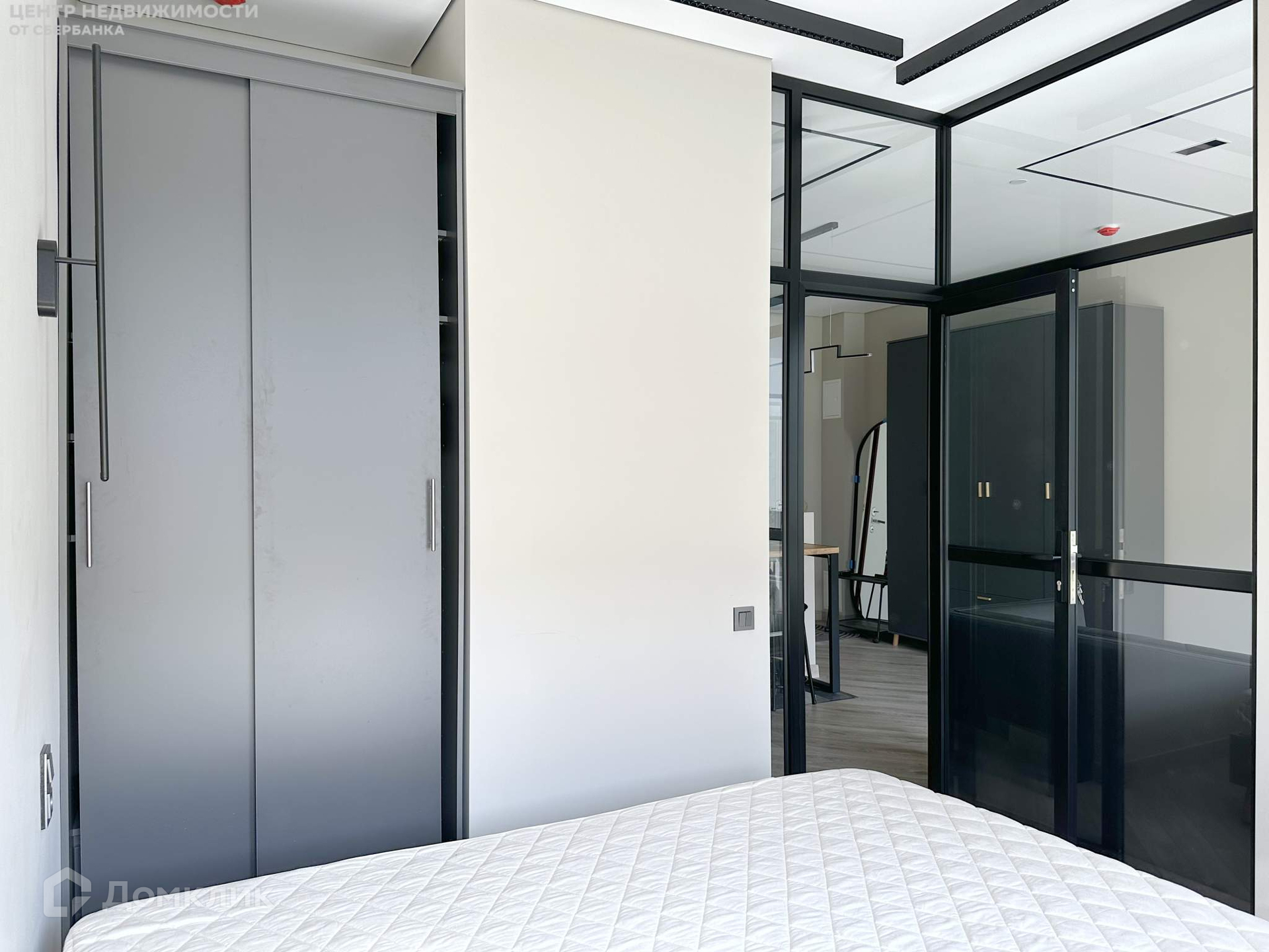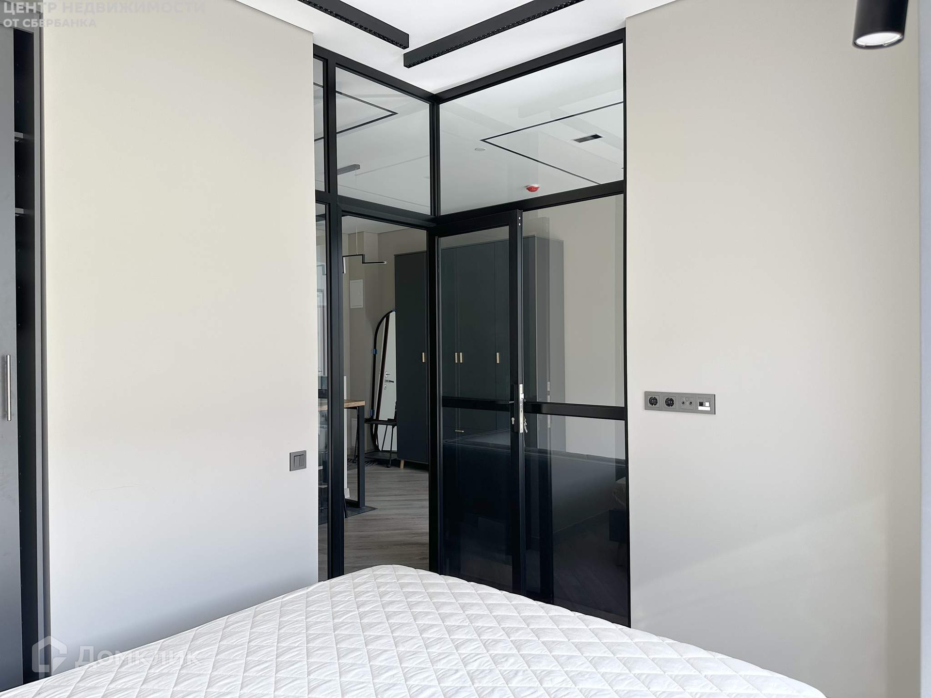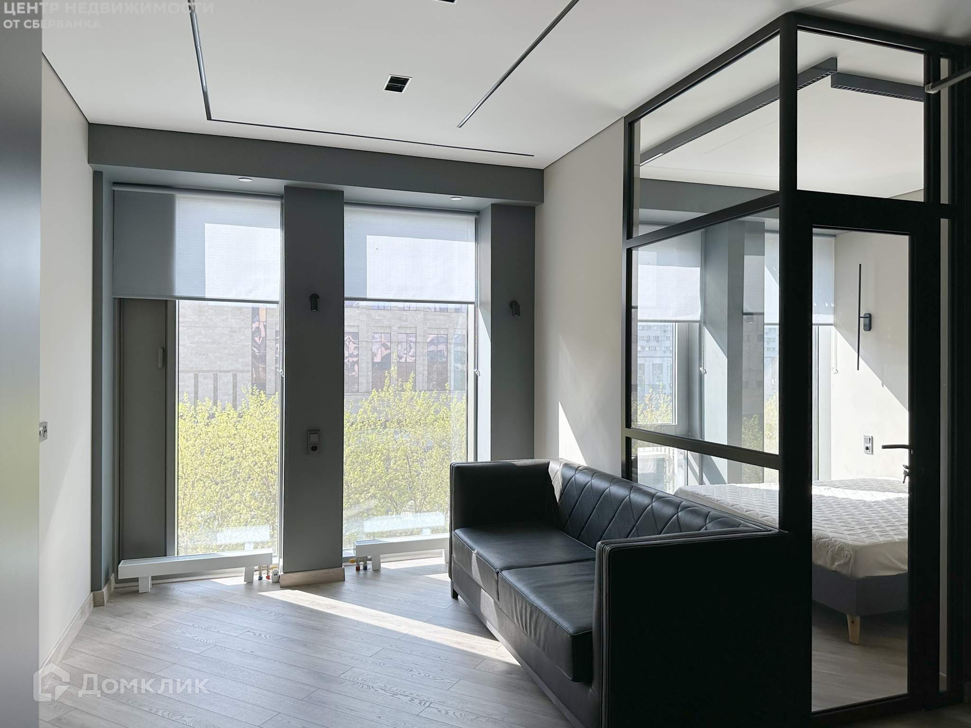 Планировкой предусмотрена отдельная спальня, отделенная стеклянной перегородкой с внушительными шумоизоляционными характеристиками, которая, по желанию, может быть зашторена. При этом за счет прозрачных конструкций помещение получает больше света и визуально увеличивается.