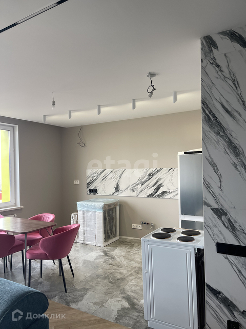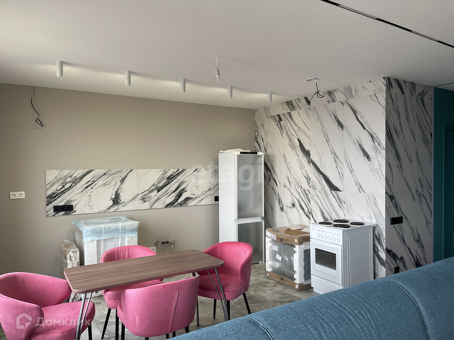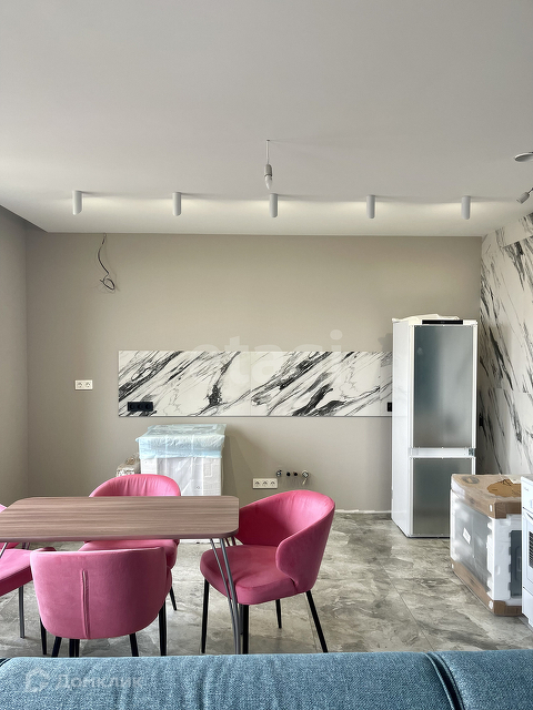 Кухня-гостиная, смежная, с общей зоной. Из техники: вытяжная труба Maunfеld (стального цвета), люстра прилагается.