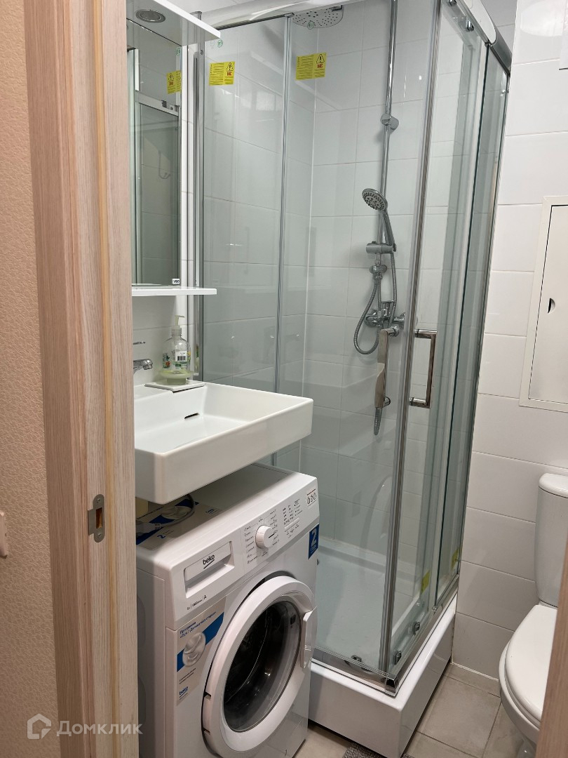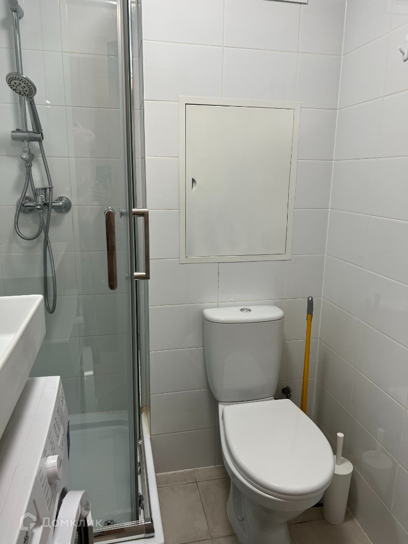 Санузел совмещённый, установлена душевая кабина, подключена стиральная машина.