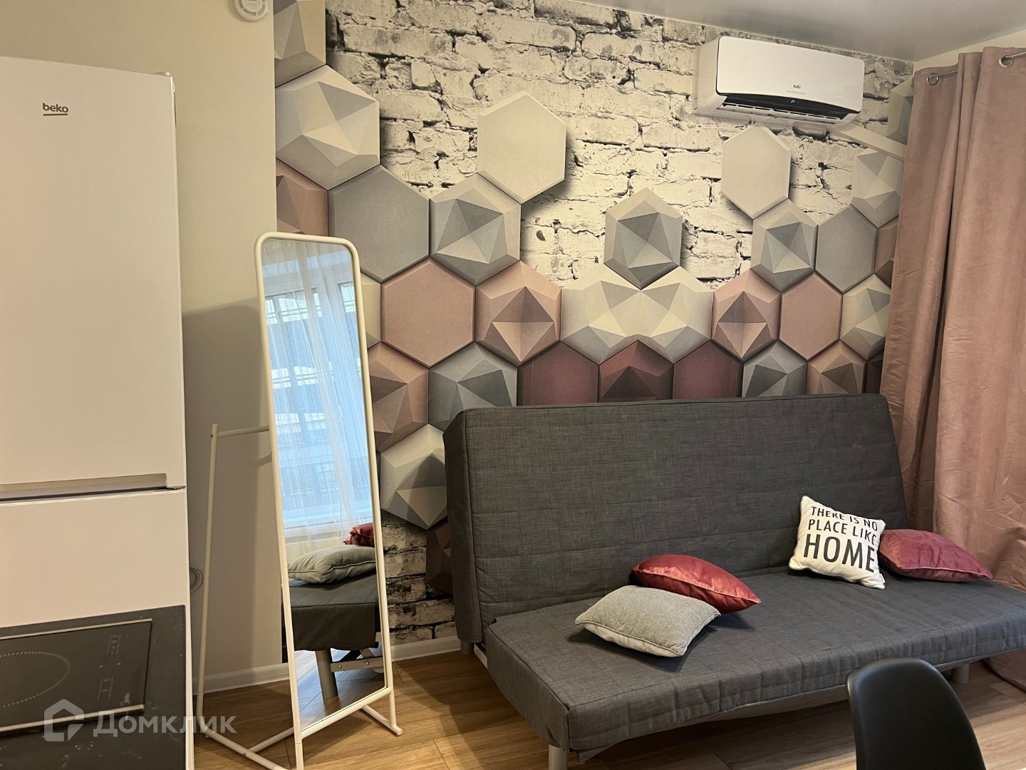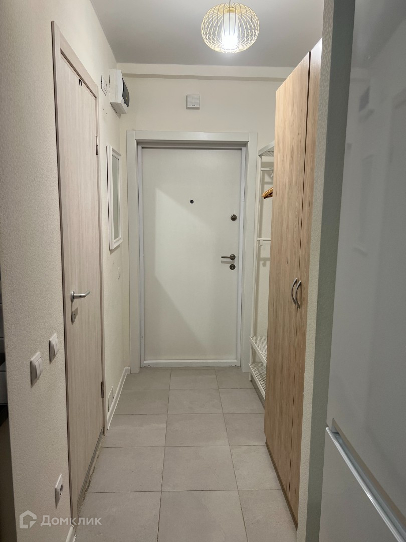 Потолок натяжной, светлые обои под покраску, пол ламинат, плитка в прихожей и санузле. Установлен кондиционер.