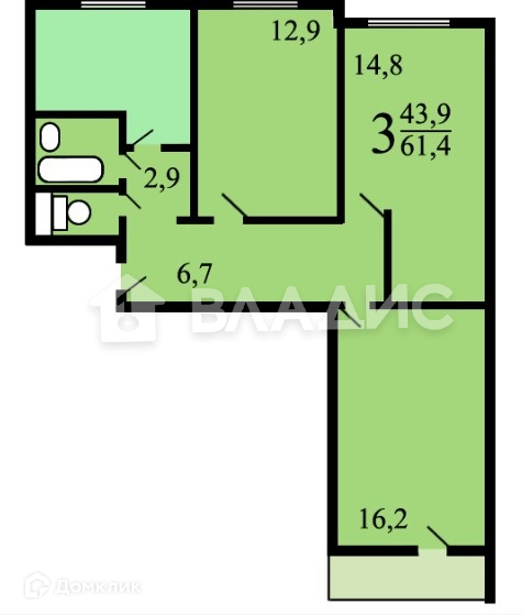 Общая площадь 61.4 м2